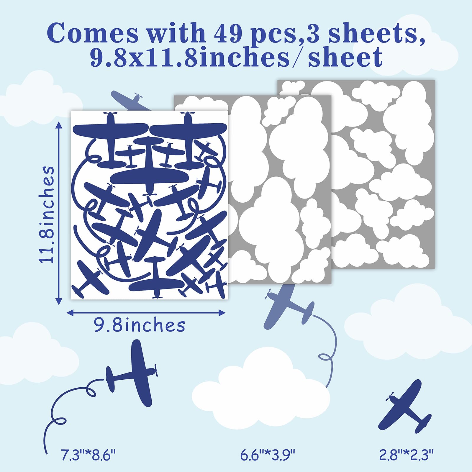 Size: Total 3 sheets (9.8 X 11.8 inches /sheet) vinyl blue planes wall stickers removable airplane aircrafts wall decals peel and stick airplane vehicles wall stickers white clouds wall decals.