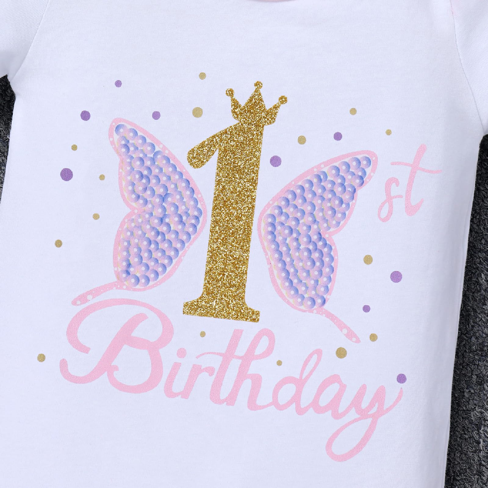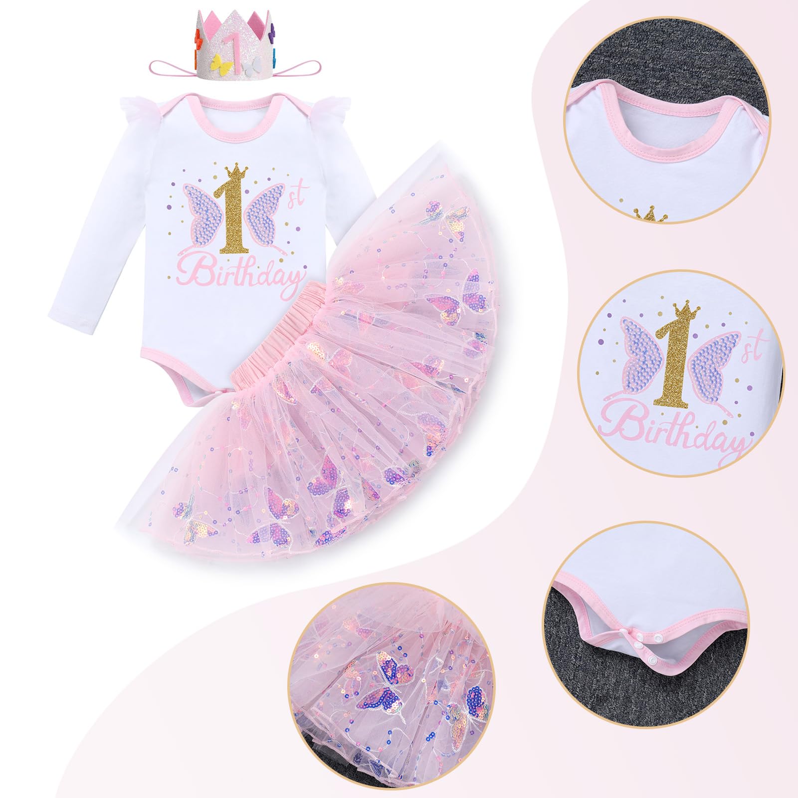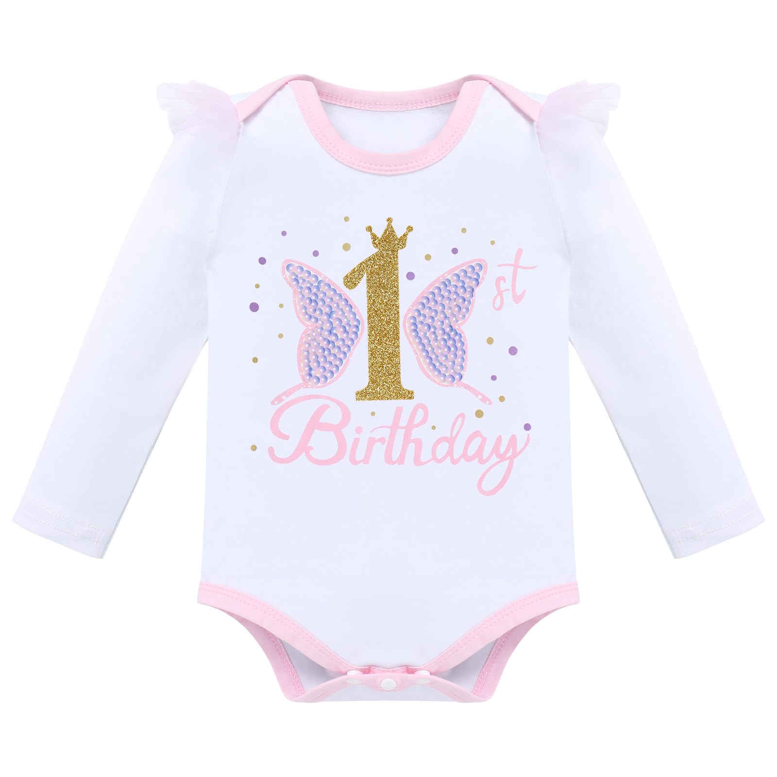 1st Birthday Butterfly Theme Outfit: Baby girls butterfly 1st birthday tutu outfit sequins butterfly romper tutu skirt headband princess dress up costume outfits. White flutter ruffle long sleeve o-neck romper, designed 1st birthday butterfly sequins wings and gold crown "1", glitter My 1st Birthday One letters, special for baby butterfly theme birthday party supplies. Bodysuit lapped shoulder with flying mesh, cute and lovely. Open crotch with 3 snaps for changing diaper conveniently.
