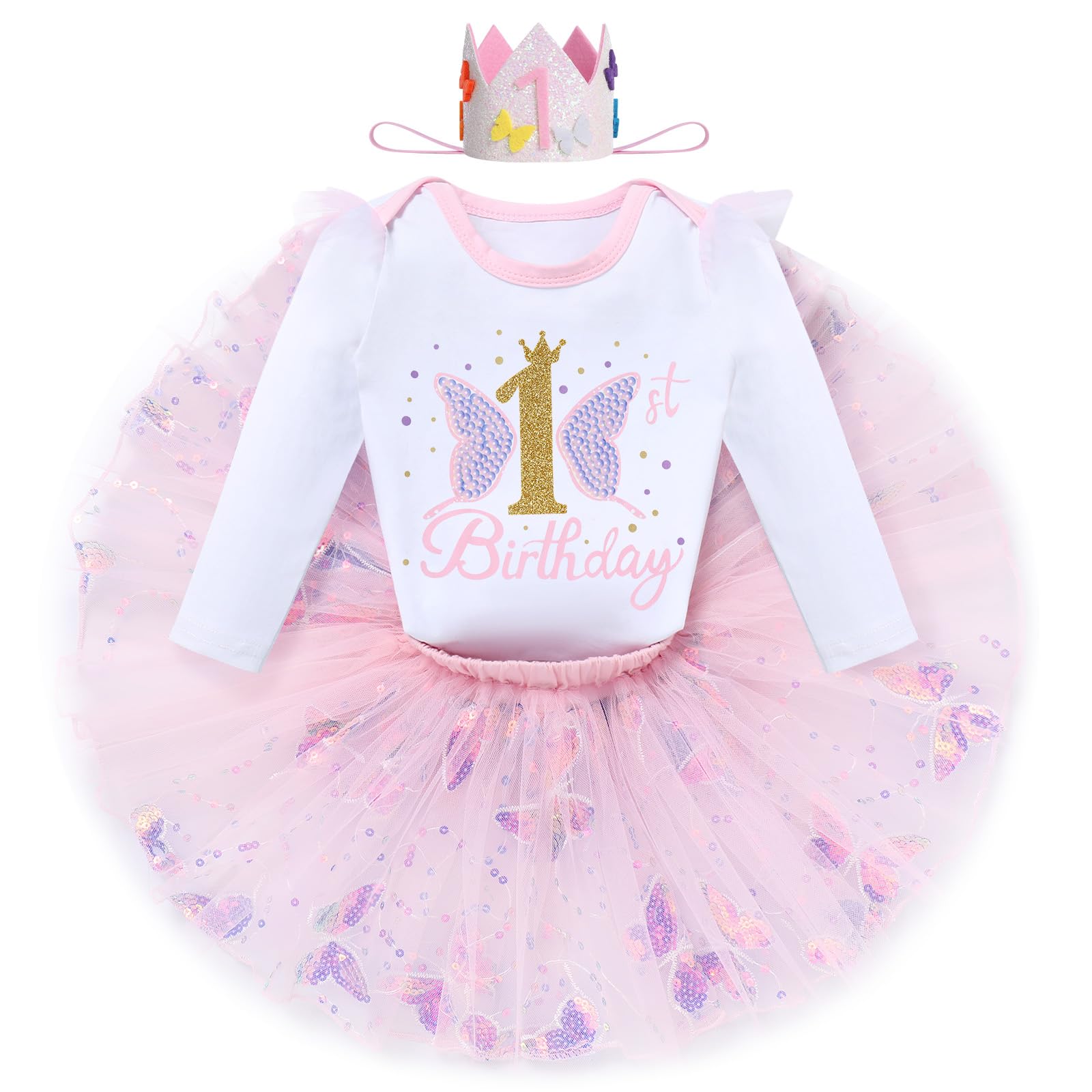 3PCS Butterfly 1st Birthday Outfit Baby Girl Tutu Skirt Set: Cute butterfly first birthday outfit for baby girl, butterfly baby girl tutu set for butterfly birthday party. Baby girl butterfly baby shower outfit for cake smash photo shoot props, 3PCS set, Long Sleeve butterfly Romper and Sequins Butterfly Tutu Skirt and Headband. Dress your little princess up with our Butterfly Themed Birthday Outfit for her first Birthday. Best as Princess Birthday Gift for 12 months 1 year old baby girl.