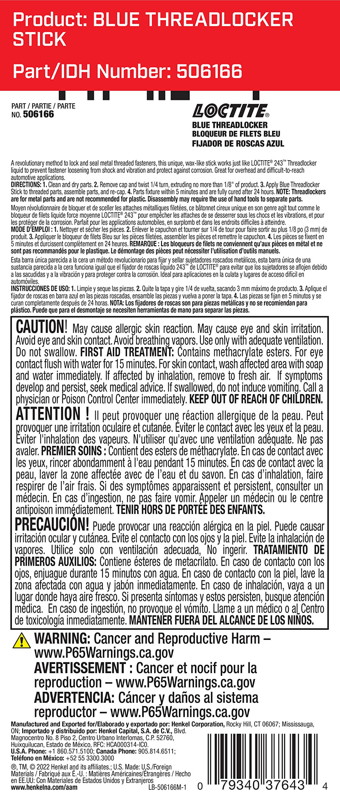 The LOCTITE Automotive Threadlocker Wax Glue Stick Blue 248 is a medium-strength, all-purpose adhesive designed for reliable thread locking on all metals. This 9 g glue stick effectively bonds with various metal substrates, including passive materials like stainless steel and aluminum, while tolerating minor oil contamination from motor oils and cutting fluids. Its drip-proof and leak-proof formula maintains integrity even in high-temp conditions, making it ideal for challenging overhead applications. The adhesive is easily removable, suitable for automotive and maintenance tasks, including valve cover bolts, water pump bolts, and caliper brackets. With a fast curing time of just 10 minutes and full strength achieved within 24 hours, it facilitates quick volume assembly and early application. Versatile in use, it is compatible with nuts and bolts ranging from 6mm to 19mm (1/4 in. to 3/4 in.), ensuring broad applicability across various fasteners.