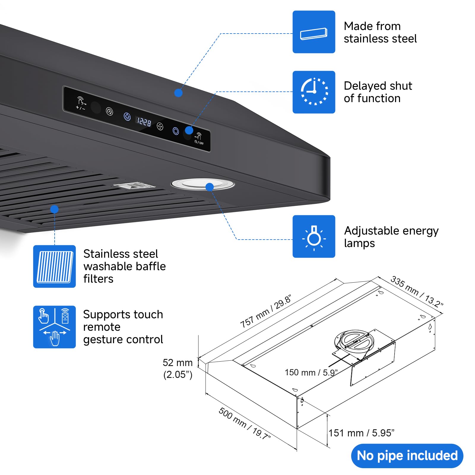 【Easy to Assemble/Disassemble】30 inch width AMZCHEF range hood matchs all modern and classic kitchens.Look concise and save space by installing it under the cabinet or wall-mounted. Kitchen extractor product size: 29.8''x19.7''x5.98''. Air outlet diameter: 6''.