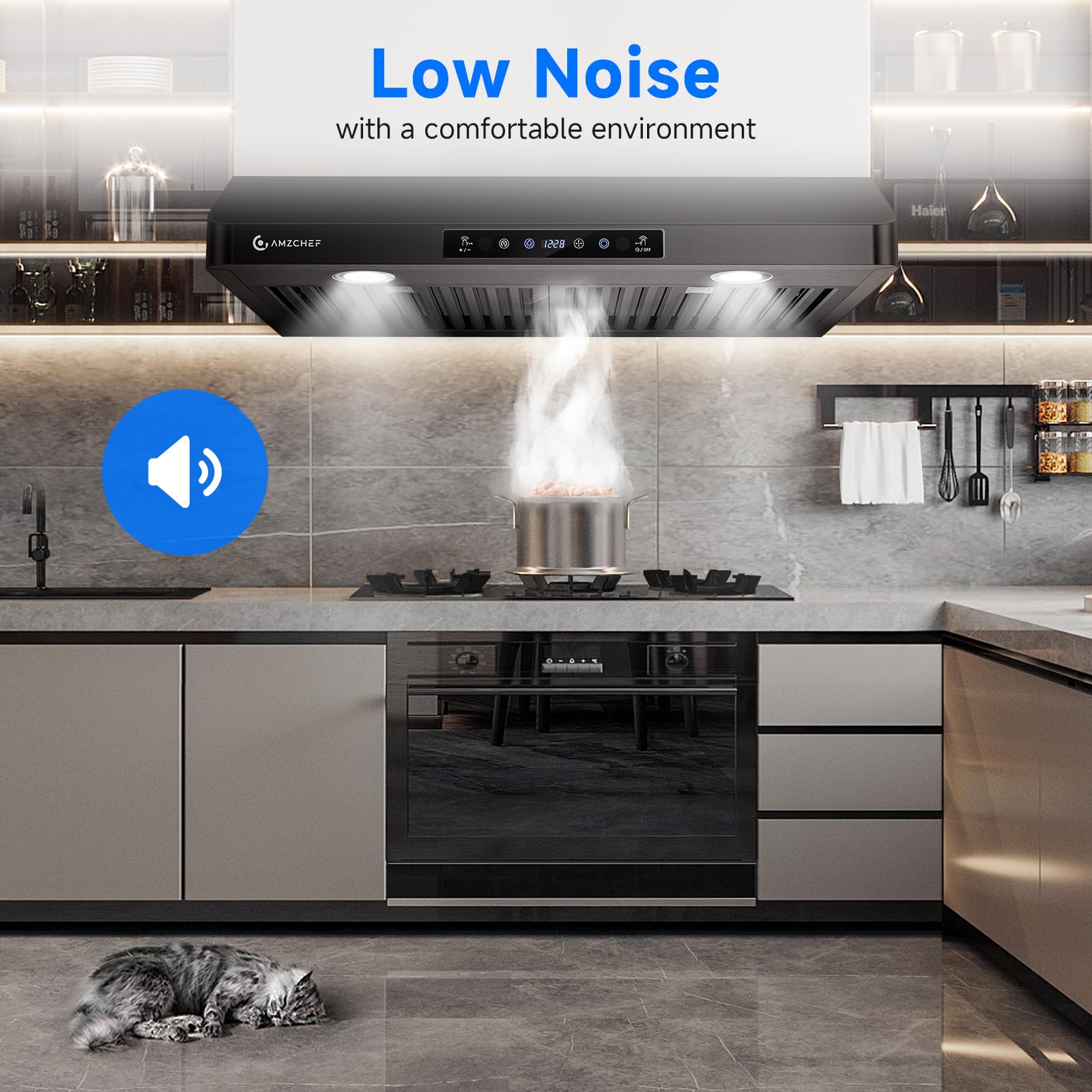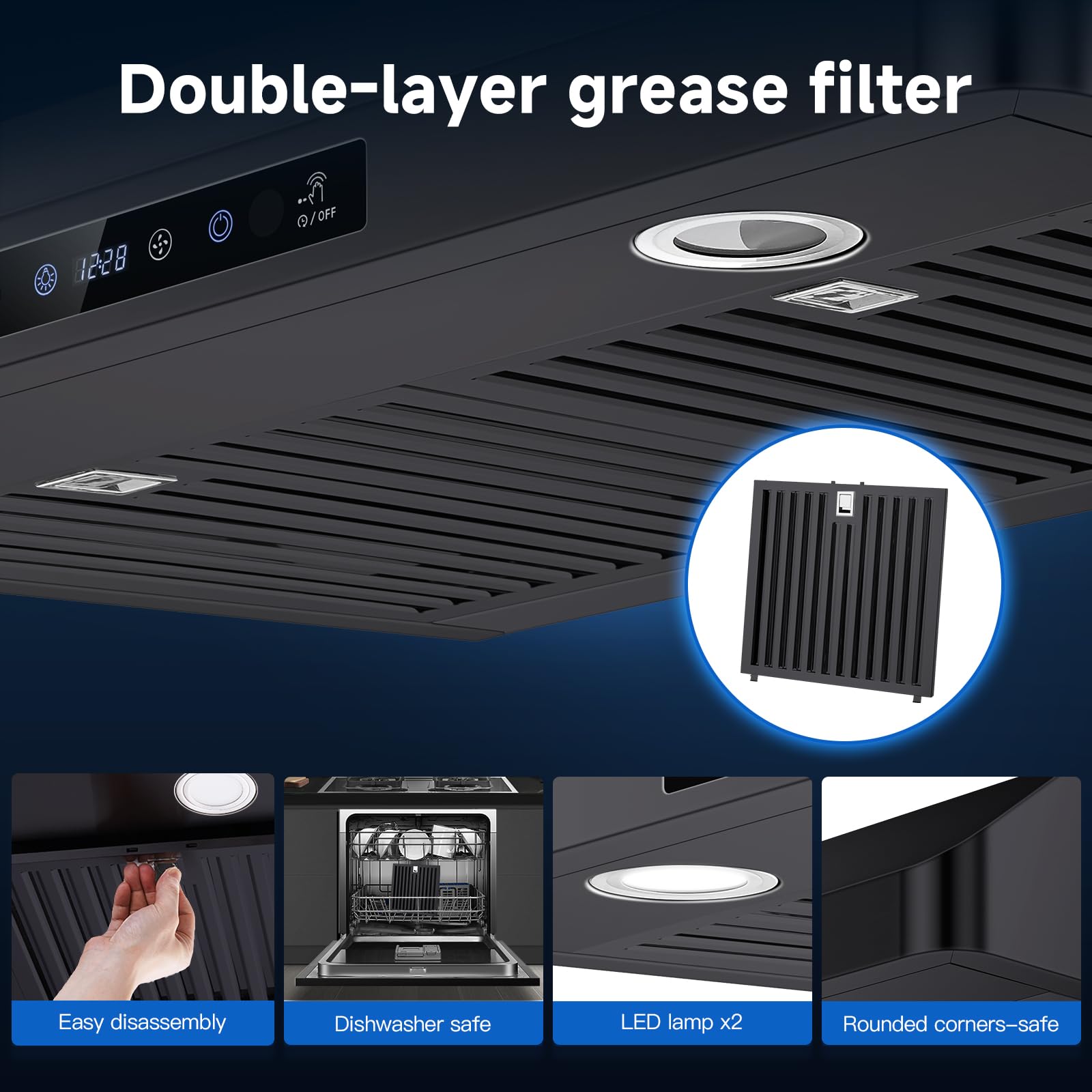 【Easy to Clean: Dishwasher-safe】AMZCHEF kitchen vent hood contains 2 dishwasher-safe stainless steel filters, high temperature resistance and effective resistance to grease, stains and rust. easy to assemble/disassemble.