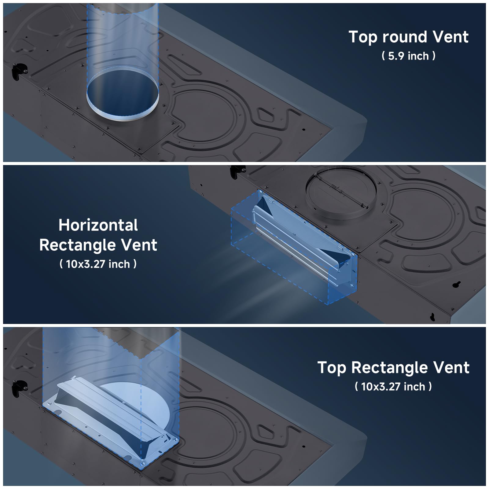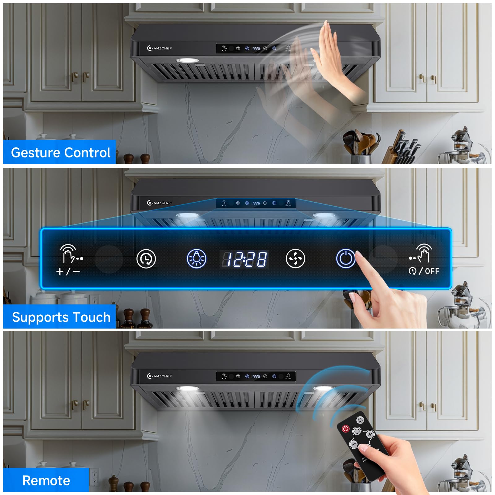 【Touch Control and Remote Control】With Smart LCD screen, touch control, stove vent hood can be operated remotely by remote control if you are taking care baby or playing with pets. Control simply and conveniently by time setting function.