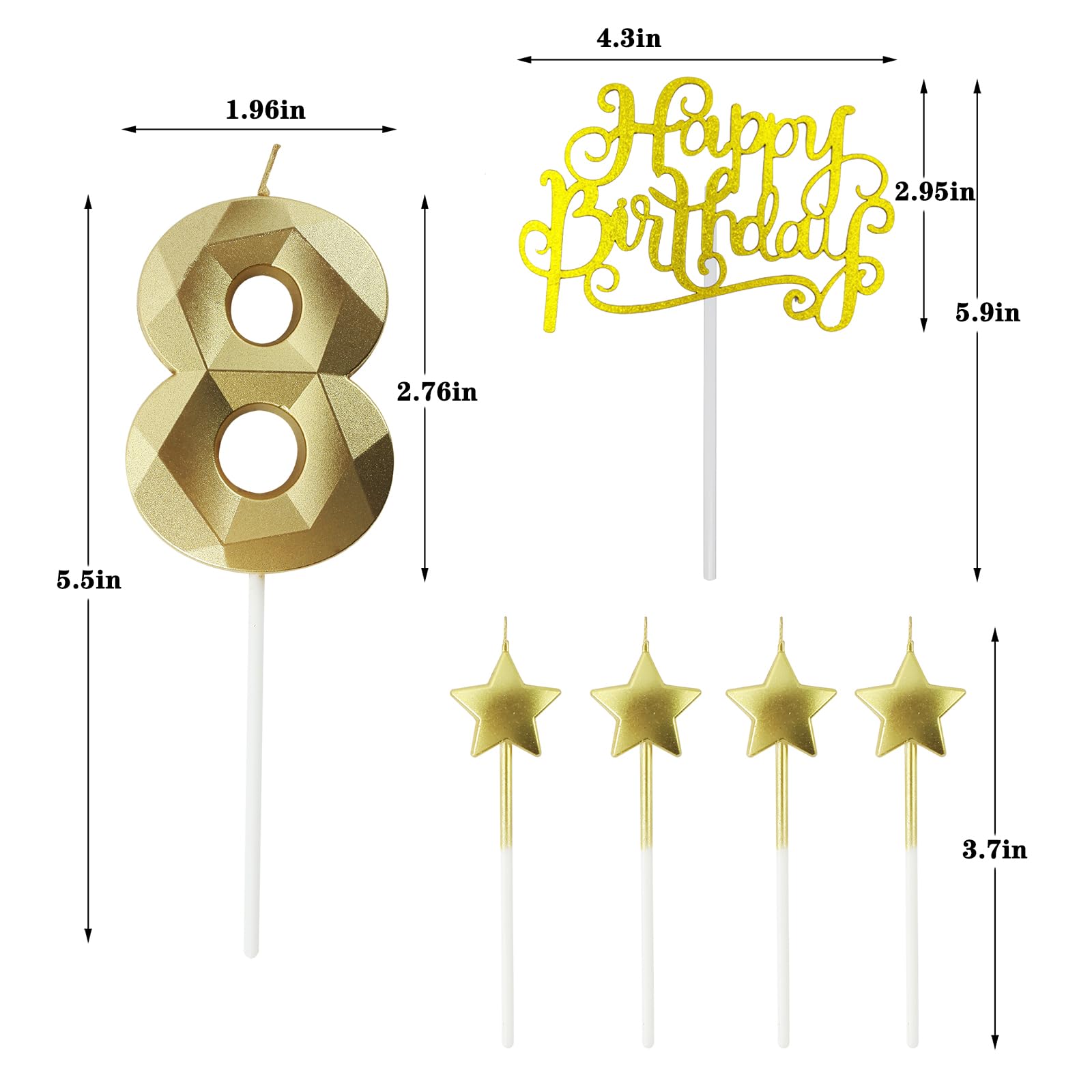 The unique diamond design and gorgeous metallic color of 3D diamond digital candles are suitable for birthday cake decorations of any size. With cute star birthday candles, it looks more unique and beautiful, full of joy. You can choose any number or combination of 0-9, such as 1, 12, 16, 18, 21, 39, 50, 60, etc. Flashing 3D digital birthday candles create unique and unforgettable surprise moments or anniversaries for your birthday party in the dark! product information: Ingredients: environmentally friendly paraffin wax Number birthday candle: 5.5 inches high, 1.96 inches wide, and 0.47 inches thick. Weight: 23g Star birthday candle: 3.7 inches high, 0.11 inches wide, and 0.35 inches thick. Weight: 3g amount of goods: Number birthday candle*2 Star birthday candle*4 Color: Gold | Size: 80 Reminder: Please do not leave lit candles unattended. Keep candles out of the reach of children. Do not place candles on or near flammable materials. Guarantee: Our customer service will provide you with service at any time. We promise to return and exchange unconditionally, and high-quality products and services are our top priority.
