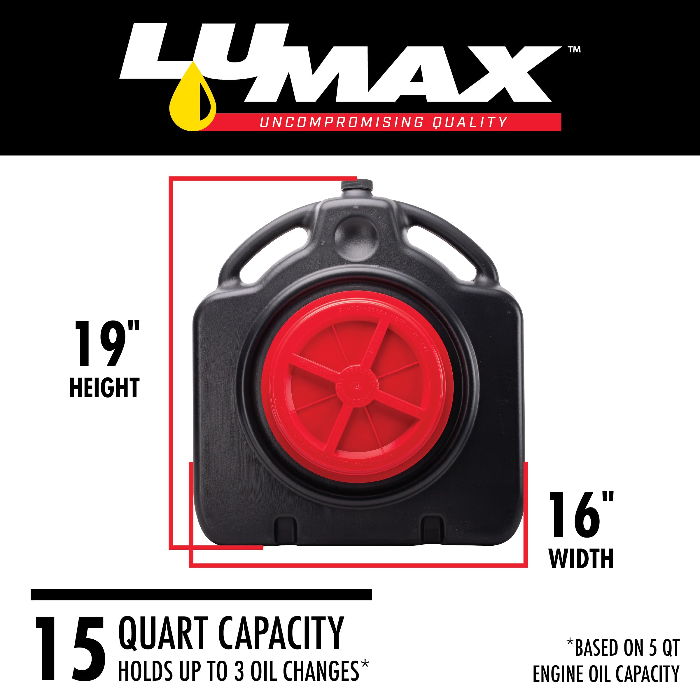 Lumax LX-1632 Black 15 Quart Drain master Drain Pan and Waste Oil Storage. Ideal for Oil Recycling, Drain Direct - No Oily Tub, Funnel, or Mess. No Mess to Clean-Up on Top or Side. Comes complete with Wheels for Slosh-Free Mobility. Catch-All Basket to retrieve Drain Plugs and Filter. Large Drain opening accommodates Dirty Oil Filters. Large 8" (20 cm) Opening with Screw Cap. Lumax is a manufacturer of lubrication and fluid management products. Our products, including grease guns, manual and electric pumps, funnels, drains, grease fittings, filter wrenches, and accessories, are built to the highest standards and incorporate many proprietary features. Lumax's mission is to provide professionals and consumers with innovative and high-quality products to get the job done right. Product development at Lumax goes beyond the physical product, to a deeper understanding of the end-users' needs. Engineered with the "user-in-mind, " Lumax products are built to the highest standards and incorporate many unique features that make work easier, faster and cost-effective. We have a passion for the design process. We listen to our customers and their ever-expanding requirements. Our unique products lead the field in design, quality, and performance.