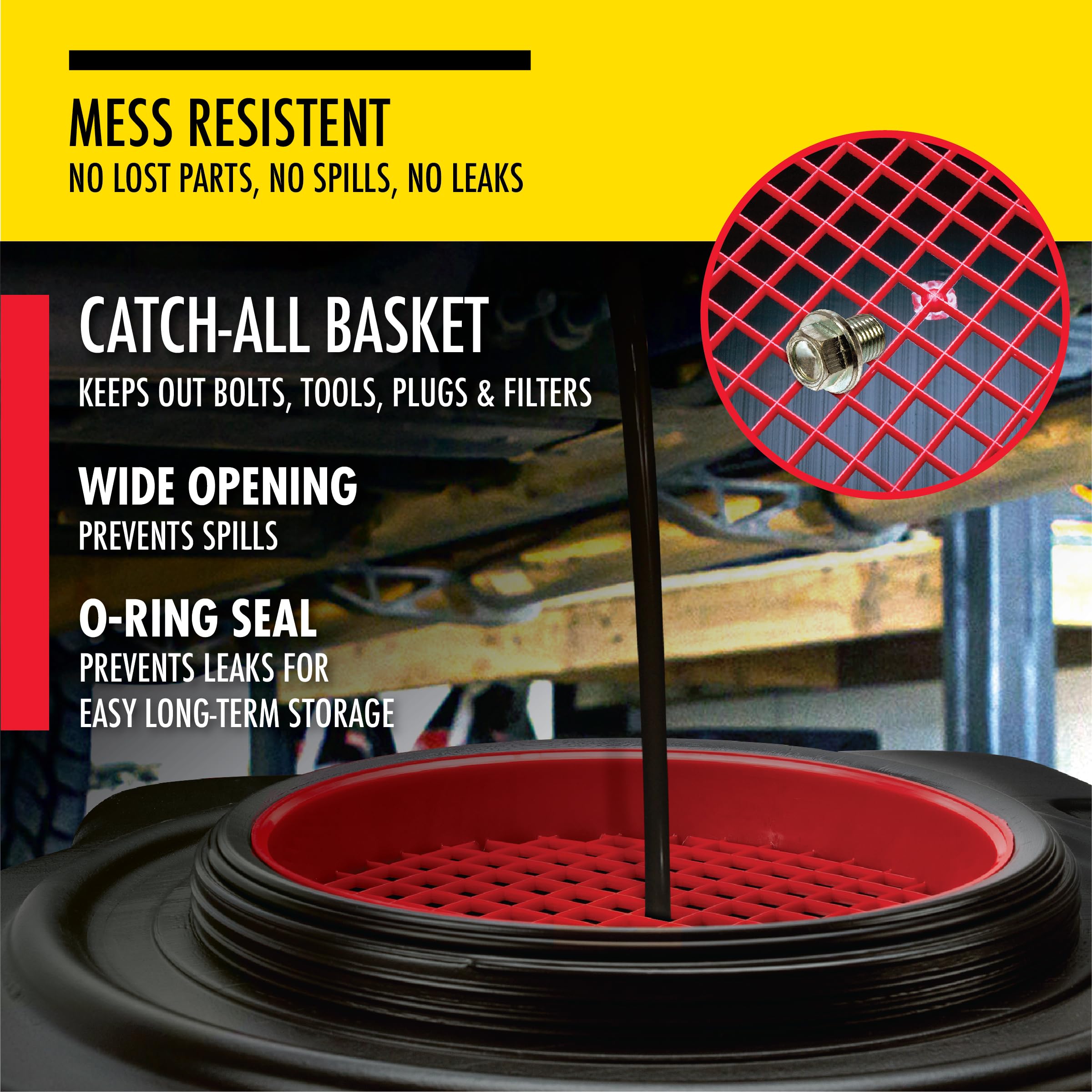 Exclusive O-Ring Seal. Catch-All Basket to retrieve Drain Plugs and Filter. Comes complete with Wheels for Slosh-Free Mobility
