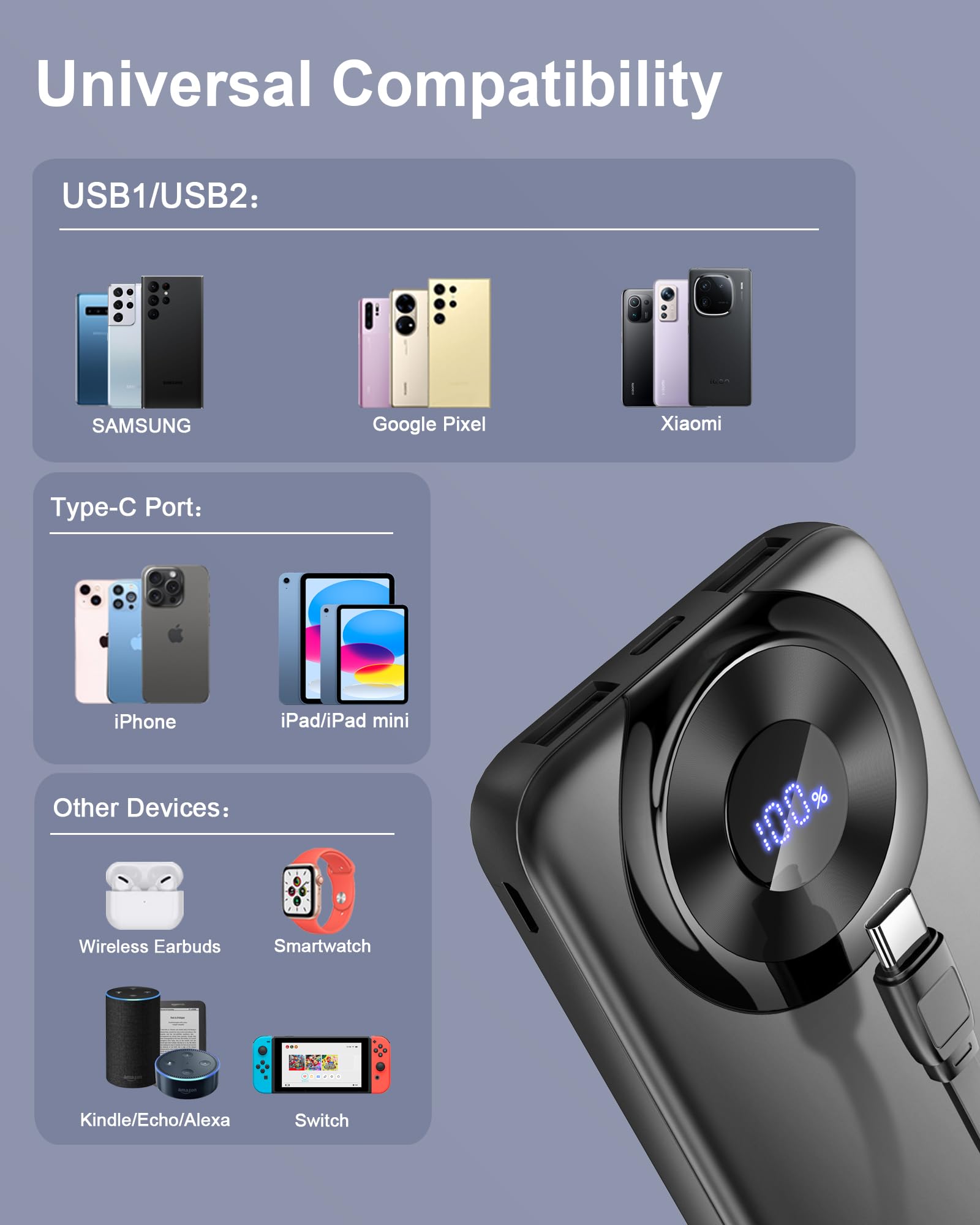 【Product Quality & Safety Assurance】 We use premium materials in the production of this portable battery charger, including a fire-resistant outer shell. The PCB board is equipped with 10 safety features to minimize risks and includes advanced smart control IC. The charger also has a built-in intelligent chip to prevent overcharging, over-discharging, excessive current, short circuits, and overheating. With rigorous 100% inspections and continuous aging tests, this charger ensures top-notch quality, enhanced safety, and reliable performance for long-lasting durability