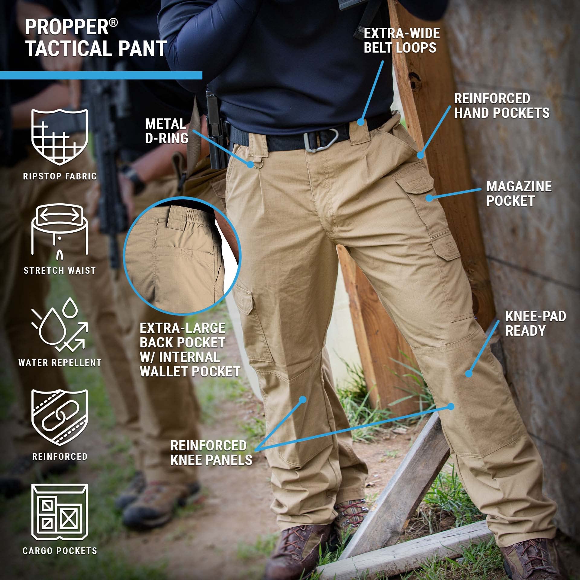 Description Perform with efficiency in the most demanding situations. The Propper Men’s Tactical Pant features a low-profile design made of lightweight, breathable ripstop fabric, coated in DuPont Teflon fabric protector to repel stains and liquids. With nine pockets, an action-stretch waistband, extra-large belt loops, you can carry your gear in comfort. The seat and knees are reinforced for extra durability, while still allowing the addition of knee pads. Belt is not included.