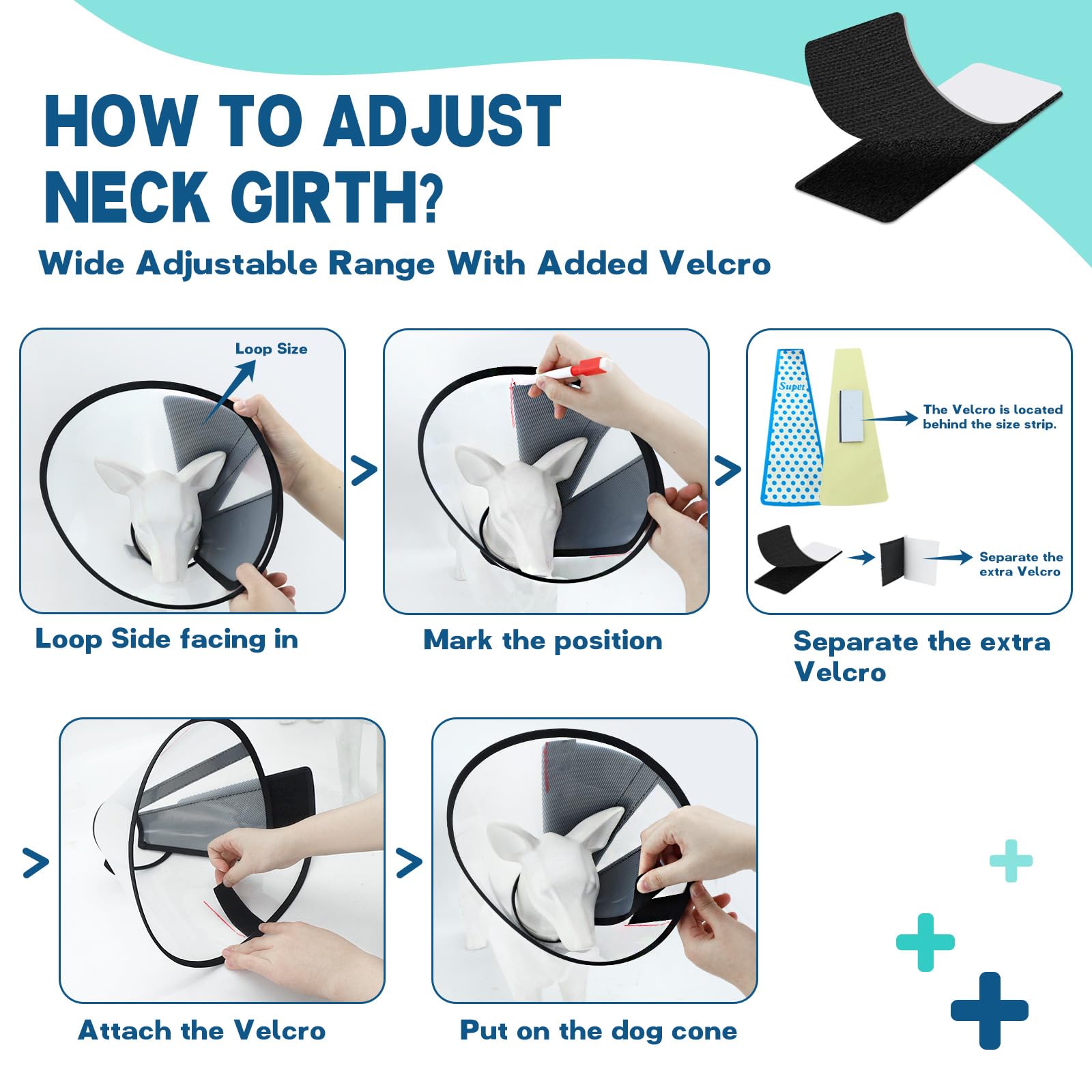 Adjustable Fit: The dog cone collar comes with two additional hook and loop strips, allowing you to customize the fit around your dog's neck. This extended adjustment range ensures a snug and comfortable fit, perfect for small dogs and medium dogs with shorter snouts.