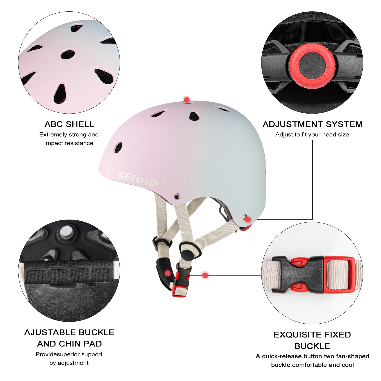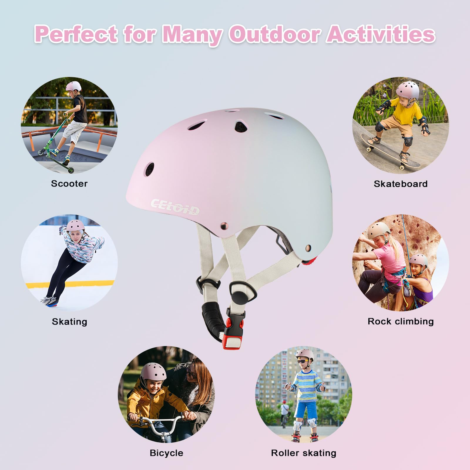 【WIDE APPLICATION】: The kids helmets are designed for kids sports saftey protection especially for any outdoor activities for many outdoor sports such as skating, skateboard, riding bikes, scooters roller, blading cycling, biking, snowboarding, balance bike ice and roller cycling skating, rolling, ATV, BMX and other extrem sports. Our goal is keep our kids away from hurt when they enjoy the joy of sports.