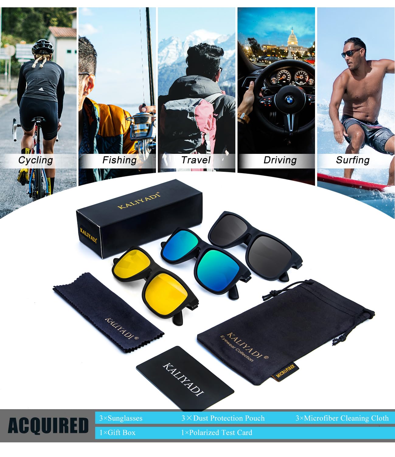 ★ Gift Idea Package and Brand Customer Service ▶ Classic sunglasses*3, microfiber pouch*3, microfiber glasses cleaning cloth*3, gift box*1. Our sunglasses for men women are also gift packed, which will be great gifts for your family and friends! All KALIYADI customers enjoy brand customer service for our polarized sunglasses. The integrity of every box and the quality of the lenses are double checked by third-party companies. And that goes with a lifetime support!