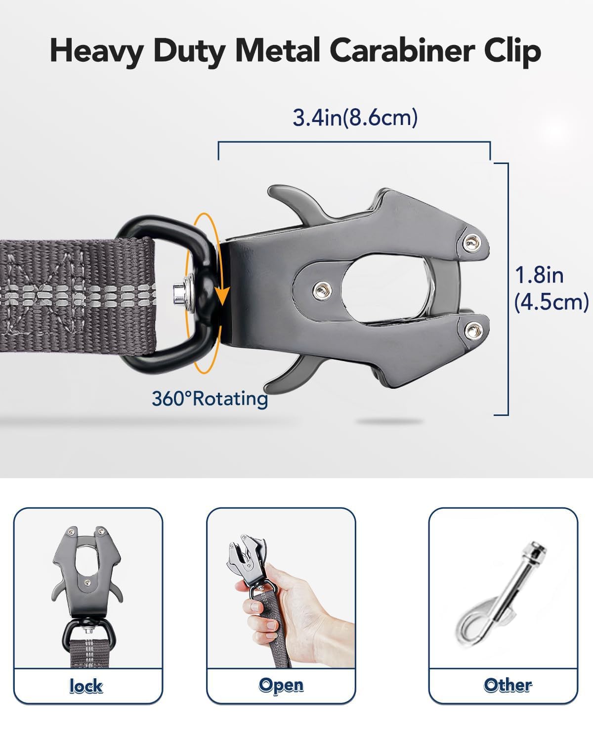 Heavy Duty Frog Clip: The dog leashes for large dogs heavy duty is fitted with a super durable Frog Clip which is made of aviation aluminum alloy. Quick release and locking dog leash buckle while holding tight under strong pull without worrying about it busting open or accidentally opening. 360°rotatable to prevent the dog leash from twisting and knotting