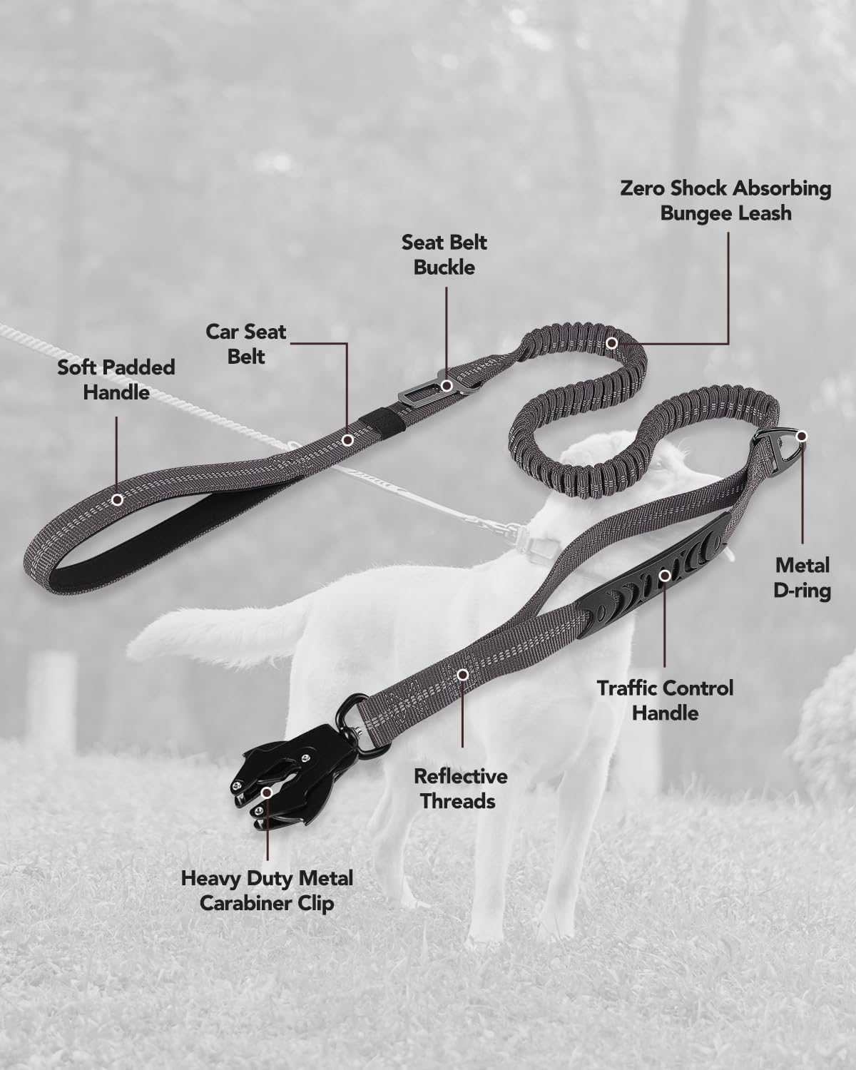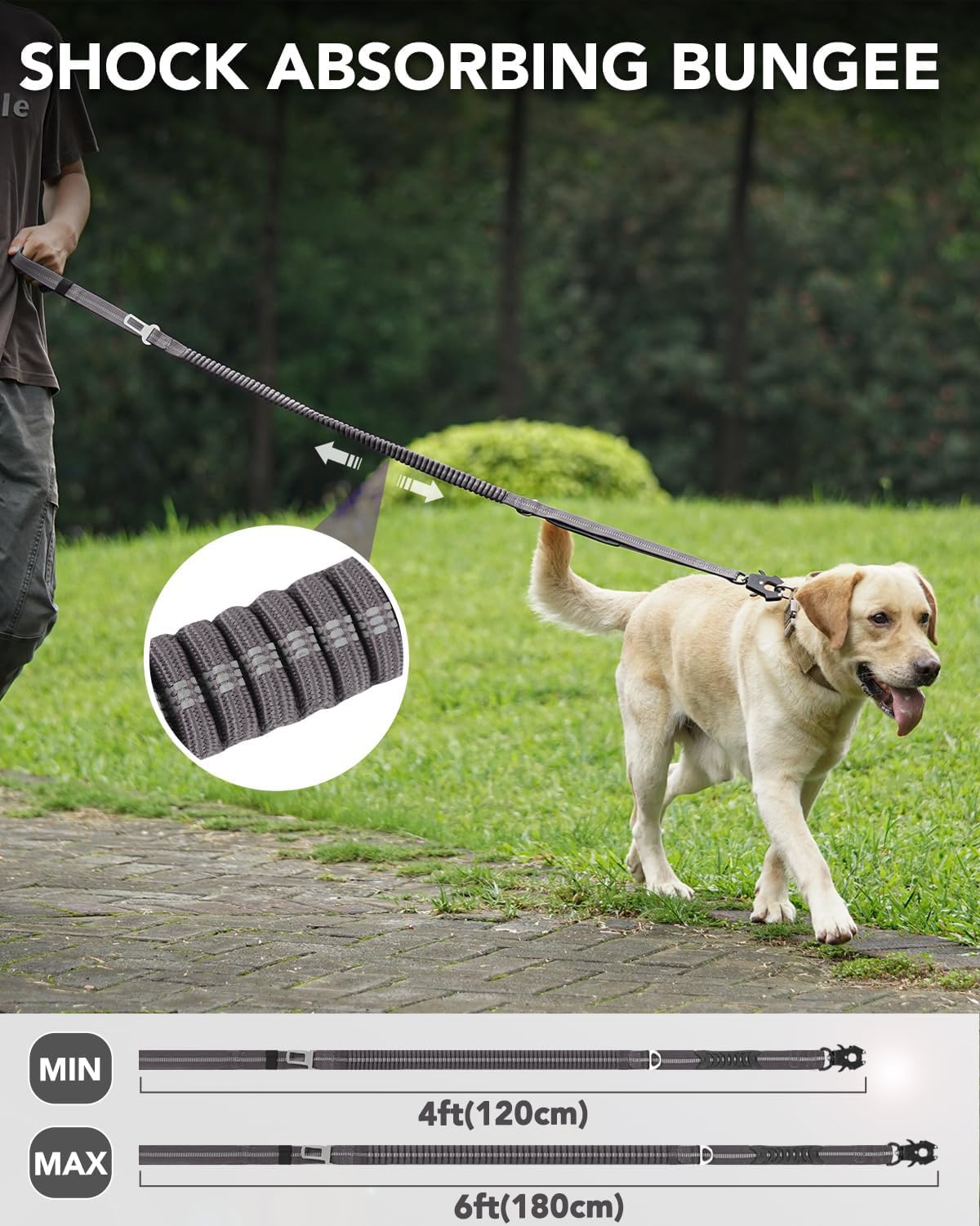 Shock Absorbing Bungee Leash: This bungee dog leash allows just enough length for the dog to wander and explore while we’re walking but not so much that the leash drags on the ground. The springy design of the leash really absorbs the pull from large energetic energetic and strong dogs without tugging on your wrist and shoulder. It has a good stretch to ease the pressure for both the owner and the dogs to make your walks much more enjoyable