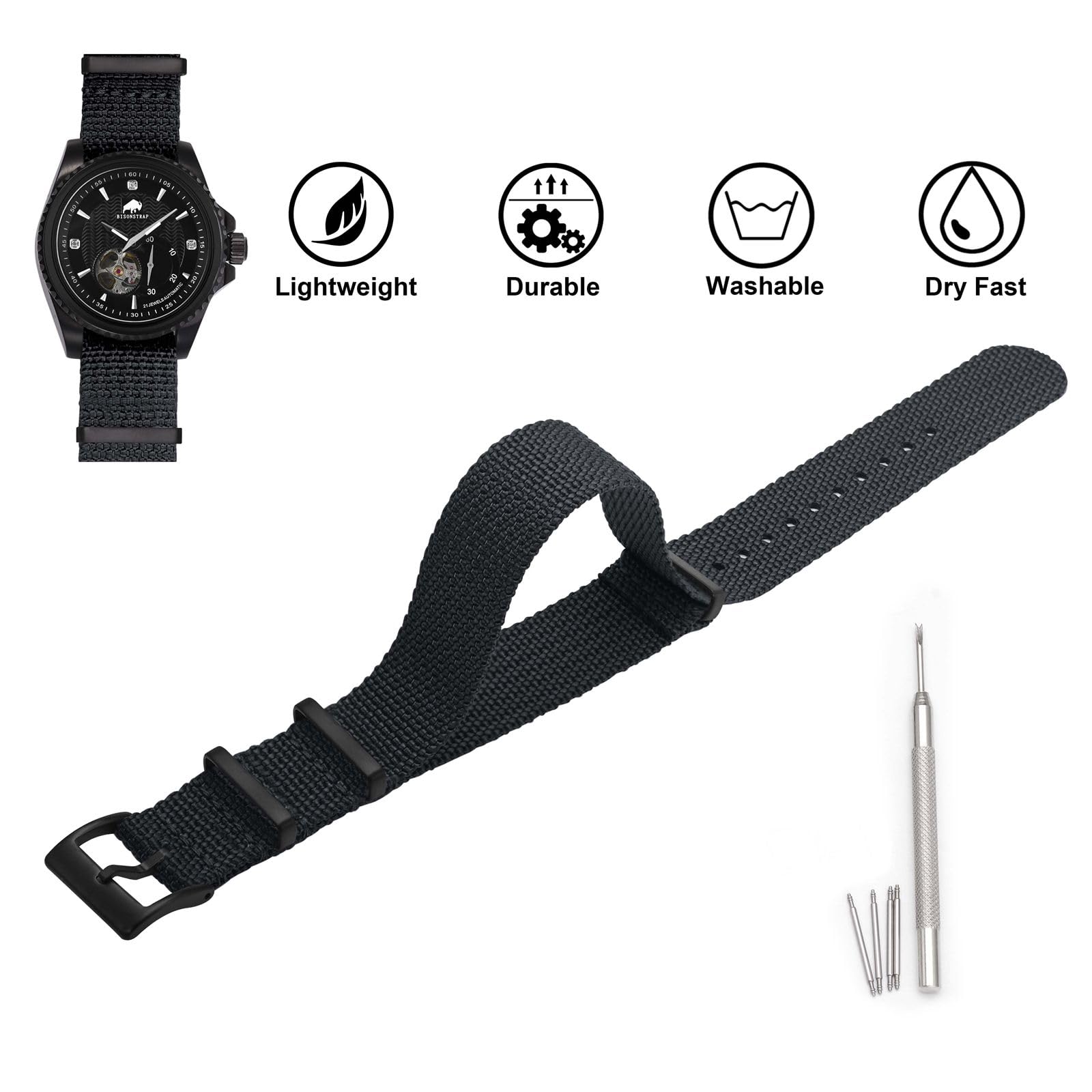 Watch Band Material: This watch strap is made of high-quality nylon, which has good elasticity and wear resistance in dry and wet conditions. Features Comfortable, durable, waterproof, and washable, and quick-drying. The buckle is made of 304 stainless steel, solid and sturdy