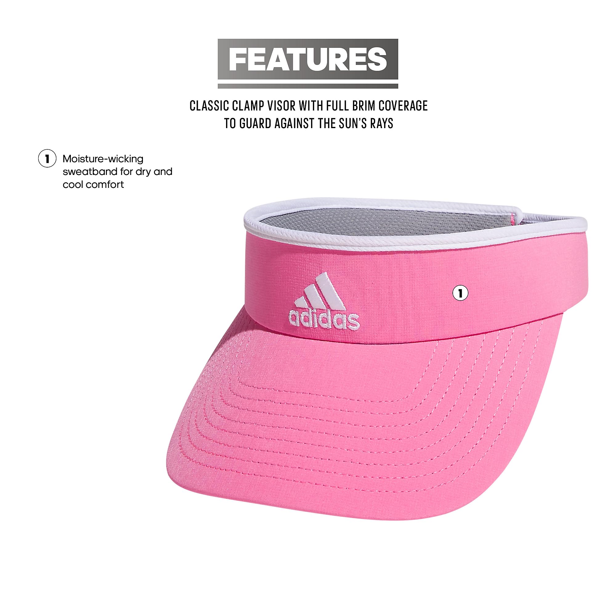 Description The Match is a classic clamp visor for simple sun coverage in fun colors and prints. Includes a moisture-wicking sweatband to keep you feeling dry.