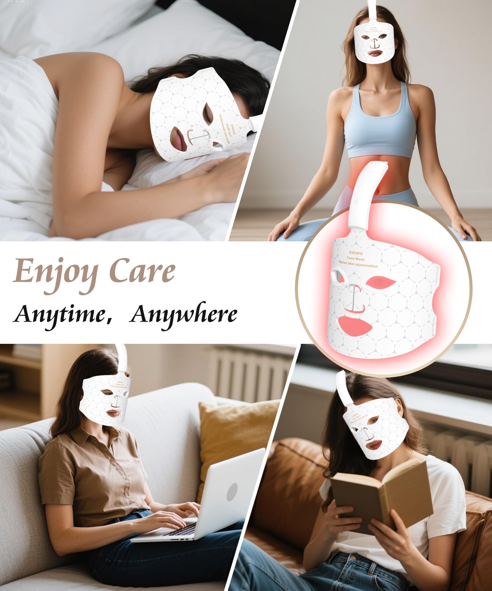 Wireless, Comfortable & Safe Design Crafted from high-quality silicone, our LED light therapy mask fits comfortably over your face, ensuring a secure and gentle fit without irritation. The wireless design allows for easy use wherever you go, making it perfect for home, work, or travel, while you enjoy a relaxing and effective skincare routine.