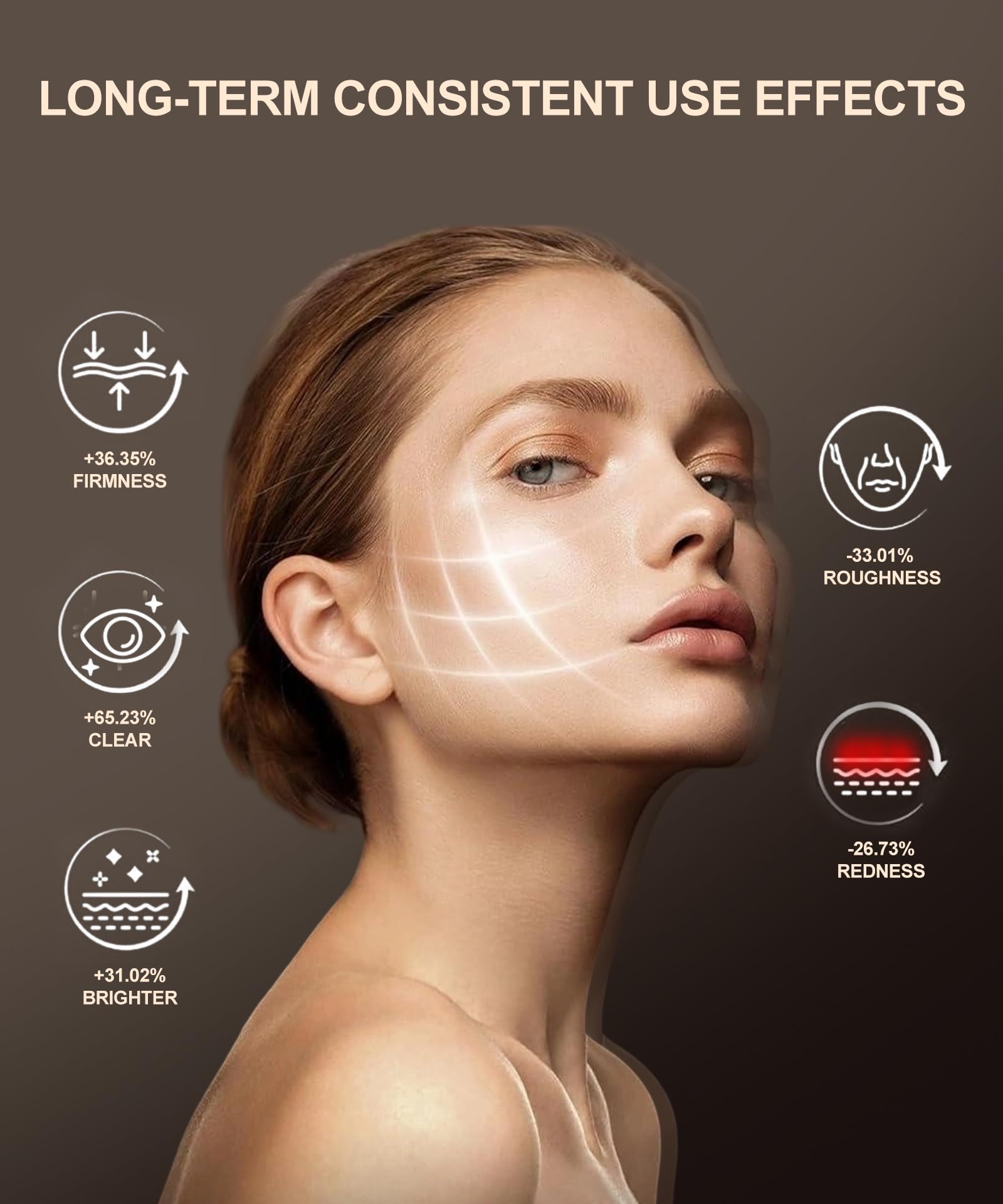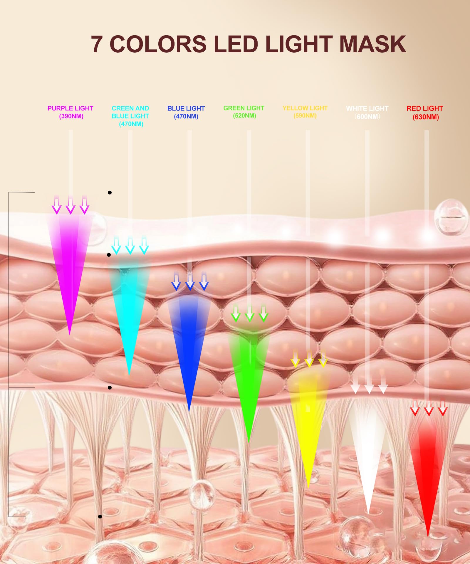 7-Color LED Light Therapy for Skin Rejuvenation These wavelengths target skin concerns such as fine lines, wrinkles, and uneven skin tone, leaving you with firmer, brighter, and younger-looking skin.The 7-color LED system targets multiple concerns: red for collagen renewal, blue for purify, yellow for brightening, green for balancing skin tone,purple for skin repair,cyan for soothing,white for rejuvenate. Experience professional-level facial rejuvenation at home.