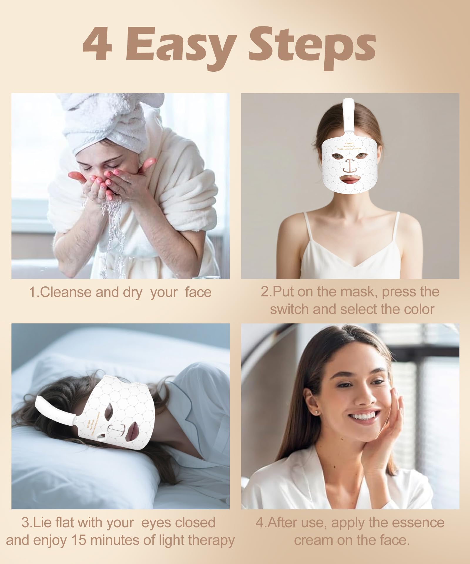 Simple to Use & Fast Results Achieve visible results in just 10-15 minutes per session. This LED face mask light therapy is designed to reduce dark circles, puffiness, and wrinkles. With 3 adjustable modes, you can customize your treatment for your specific needs. Use with your favorite serums or moisturizers to enhance absorption and hydration.