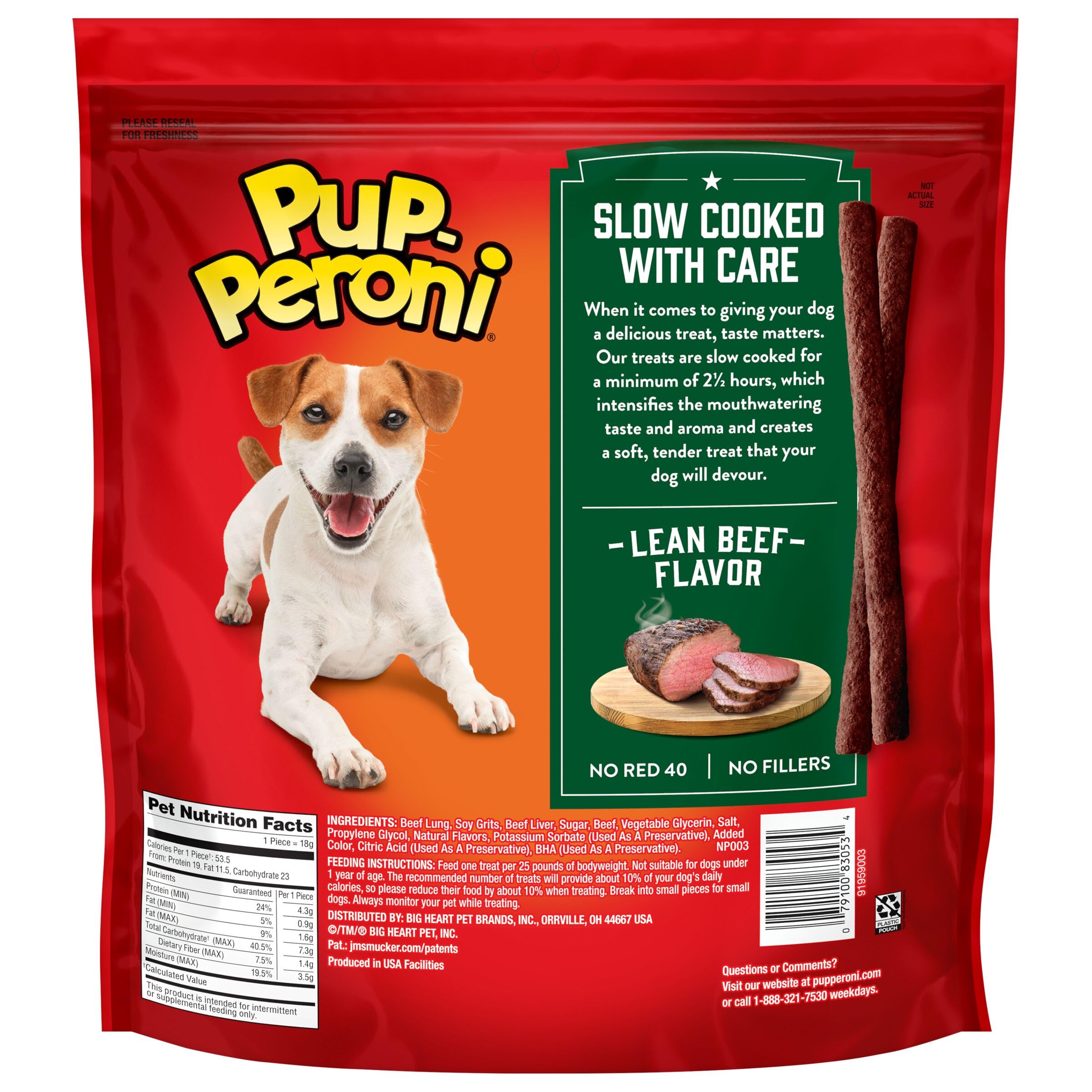 Who says less fat means less flavor? Pup-Peroni Lean Beef Flavor dog snacks are 90% fat free, but still have that meaty taste and mouthwatering aroma dogs love. They’re made with real beef, so your dog gets high-quality protein in every bite. And in case that’s not enough to get your pup pumped — Pup-Peroni slow cooks their dog treats for at least 2.5 hours, which helps retain moisture and intensifies the taste. The result is an irresistibly rich, meaty treat with a soft, tender texture dogs can sink their teeth into. It’s everything your dog wants in a treat … and yet, nothing you don’t. No fillers. No Red 40. Just the crazy-good soft dog treats your dog craves. So, pick up a bag and treat your dog to big beefy flavor!
