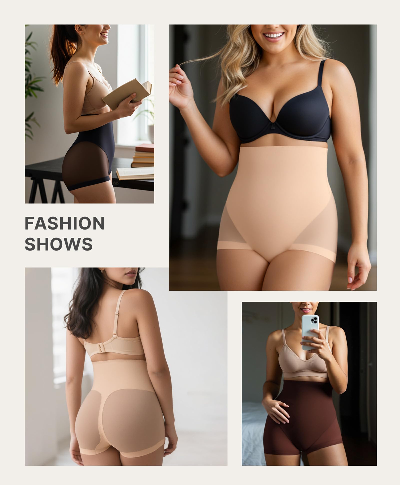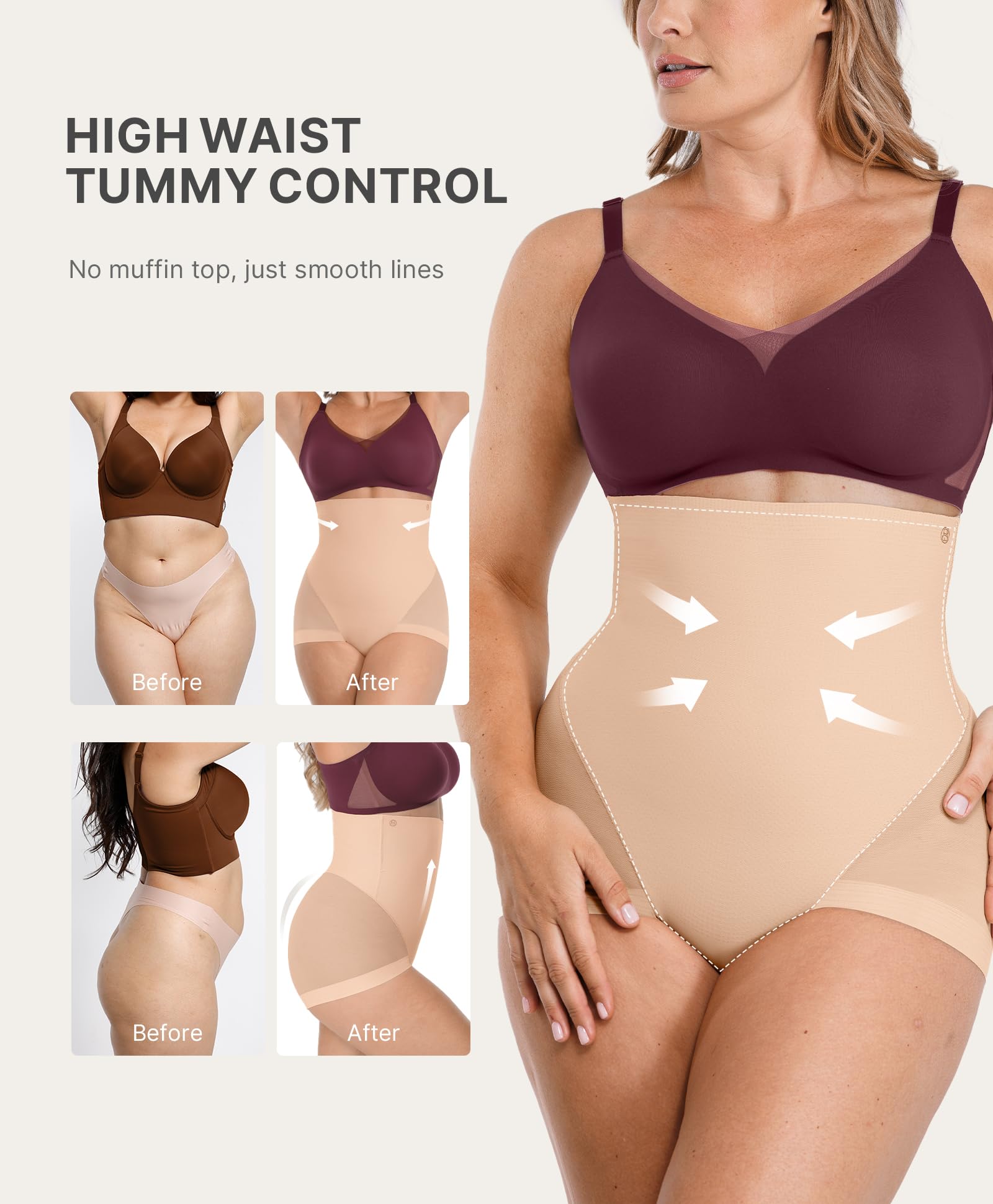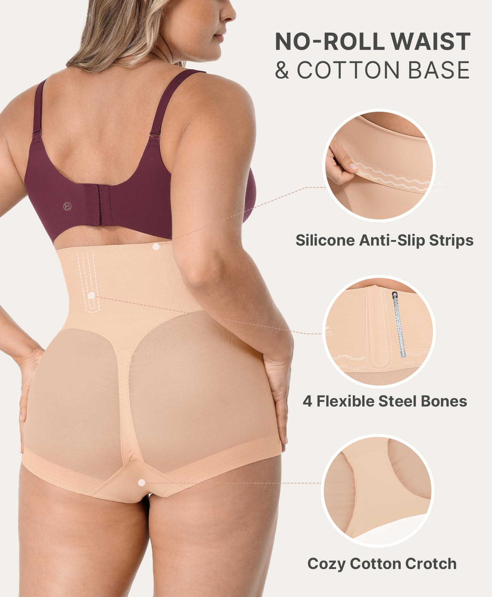 360° NO ROLL: Double-layer wave-grip strips inside the waistband and four built-in steel bones at sides and back work together to prevent rolling and provide back support. Stay confident and distraction-free with no tugging or adjusting needed, as the shapewear stays put during daily tasks or workouts.