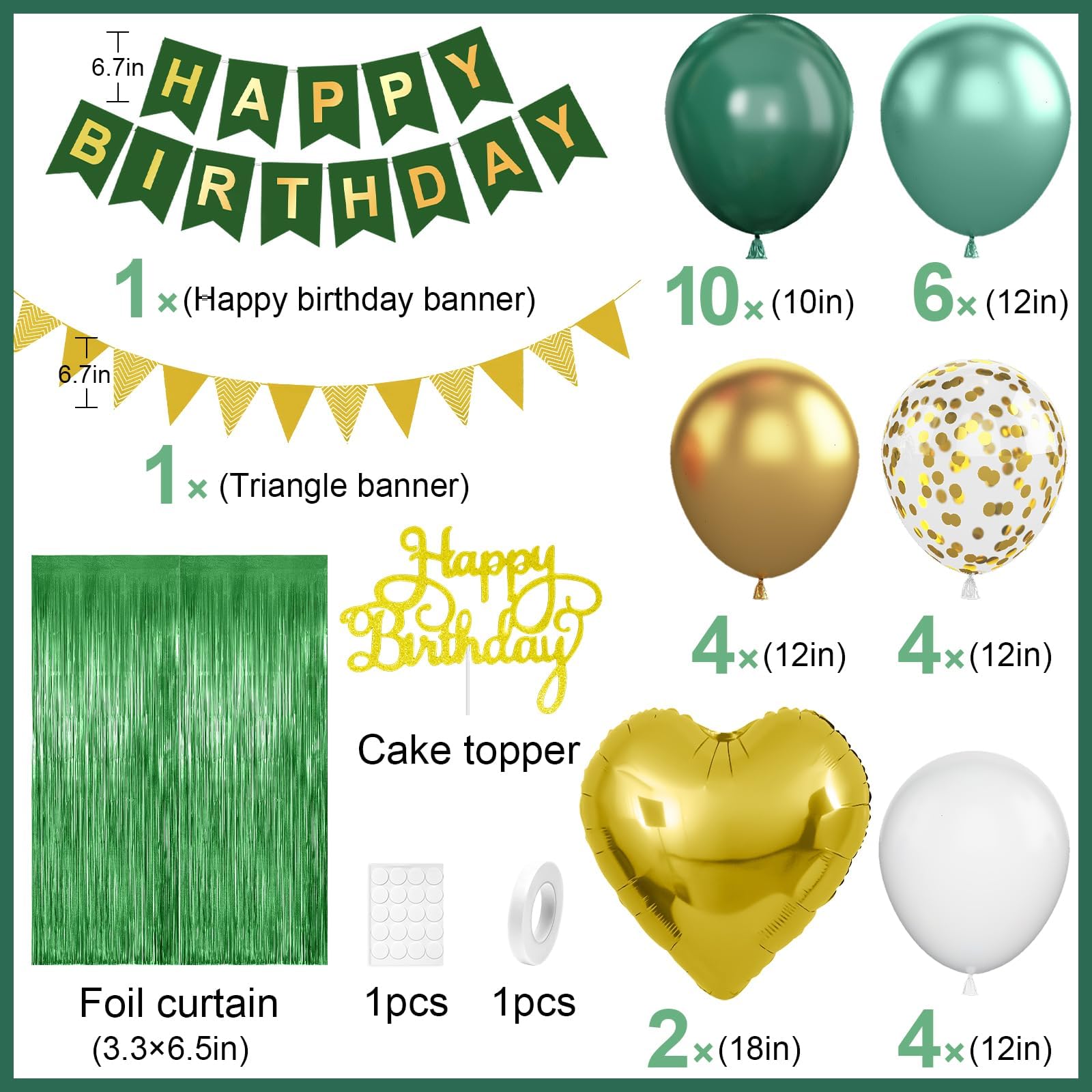 DARK GREEN AND GOLD BIRTHDAY DECORATIONS KIT INCLUDES: 30pcs latex balloons (dark green balloons,white balloons,metallic gold balloons,metallic green balloons,gold confetti balloons),1pcs green gold "happy birthday" banner,1pcs green curtain background (2 meters),1 triangle bunting,1gold birthday cake topper,2pcs gold foil heart balloon,1 glue,1ribbon.