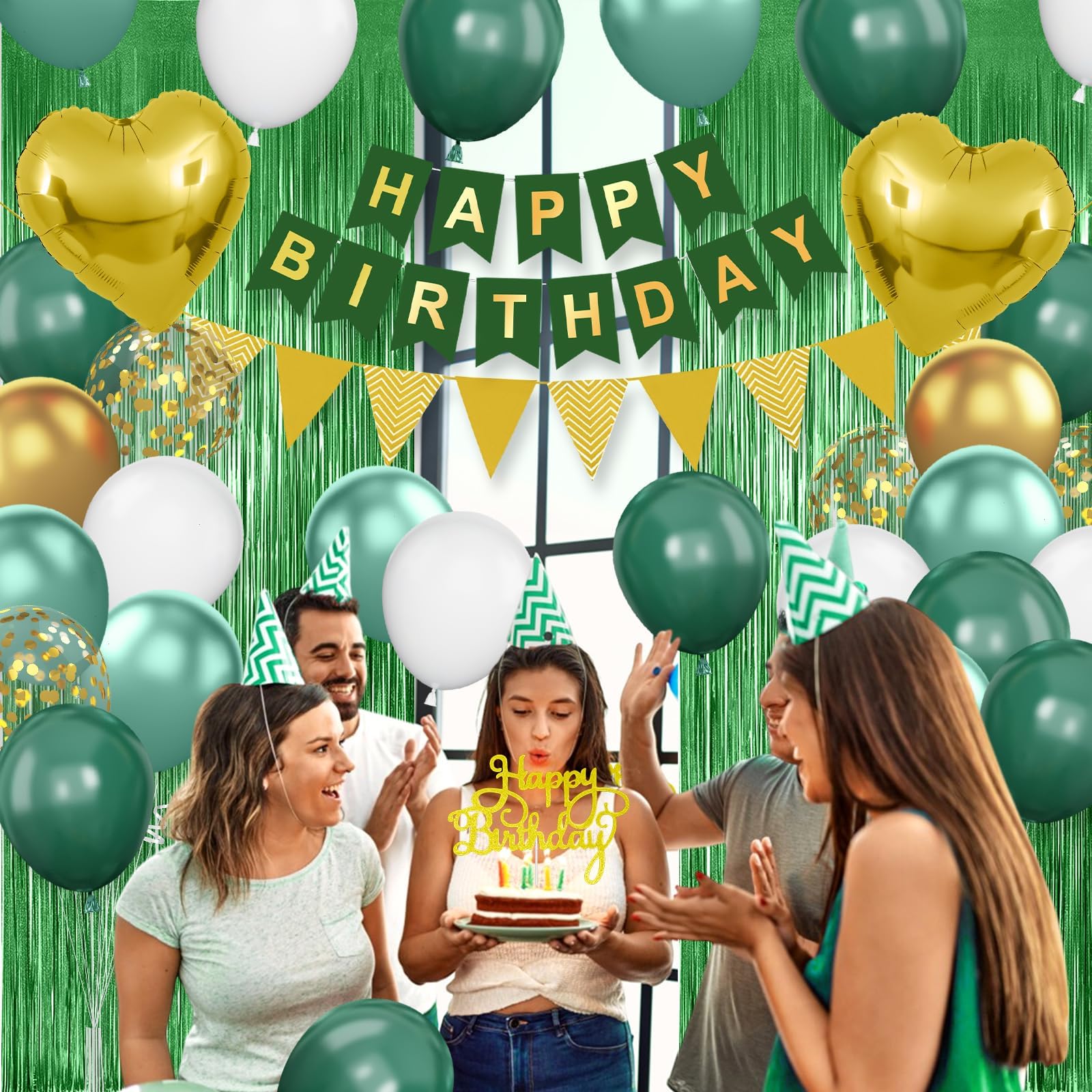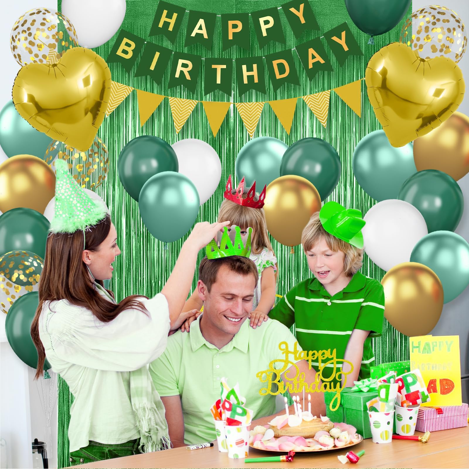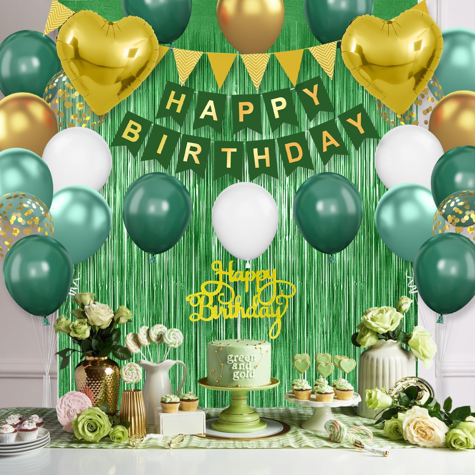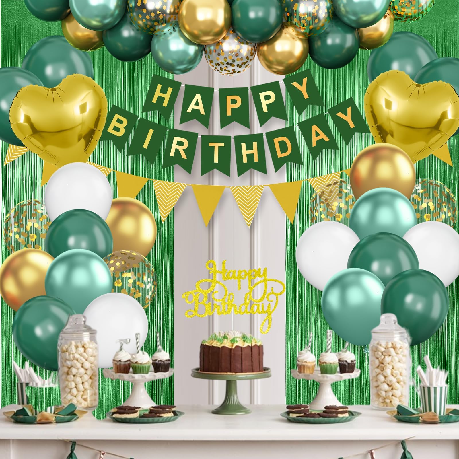 UNIQUE AND VIBRANT DESIGN: Featuring a variety of balloons,swirling decorations,a bright birthday banner,and shimmering tassel curtains,this happy birthday decorations kit provides a dazzling background for your dark green gold birthday party for men women boys girls birthday celebration. The cohesive green gold color scheme ensures your party stands out and leaves a lasting impression.