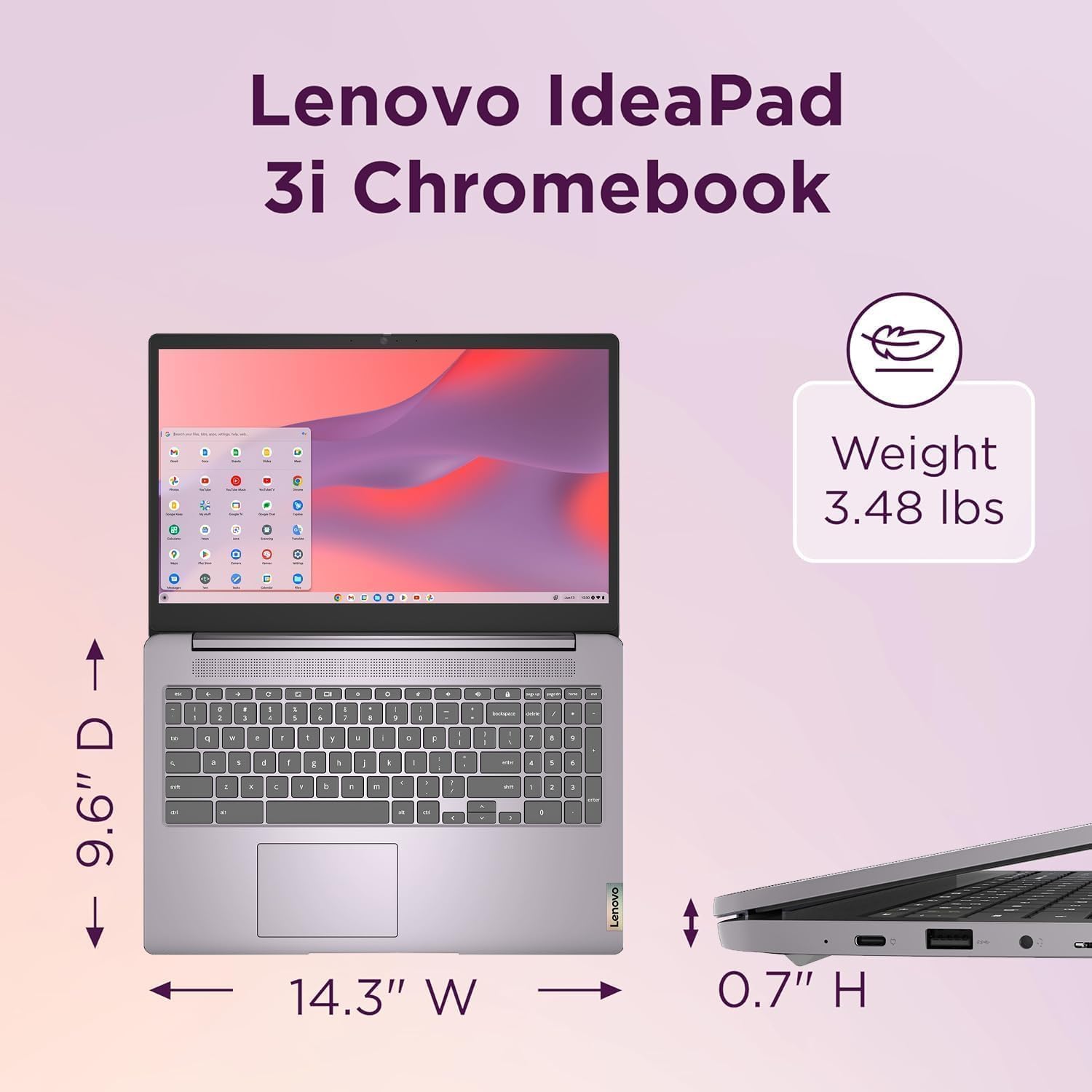 Multitask at full power Work, play, and multitask to your heart’s content on the Lenovo 3i Chromebook (15" Intel) with a quick and nimble system that’s packed with more performance than ever thanks to the Intel Celeron processors. And with a battery that lasts all day, you can enjoy this power anywhere you want. Made for ease of use Enjoy more screen real estate with narrow bezels on the 15.6″ Lenovo 3i Chromebook with an FHD display that’s easy to share with friends. And with the Anti-glare display, users have a more intuitive experience, while its privacy shutter gives you security after video calls. Secure & long-lasting The Lenovo 3i Chromebook (15″ Intel) has your cybersecurity needs covered. Keep calm and stay focused on your tasks at hand—as the Chromebook starts up, it goes through Verified Boot—a rigorous and seamless security check in the background that prevents malware and automatically switches back to a previous version of the system if anything suspicious is detected. Technical Specifications Display: 15.6" FHD (1920x1080) TN 220nits Anti-glare display Processor: Intel Celeron N4500 Processor (2 cores 2 threads, base clock speed 1.1GHz, max turbo to 2.8GHz, 4MB Cache) Graphics: Integrated Intel UHD Graphics Networking: Wi-Fi 6, 802.11ax 2x2 + Bluetooth 5.2 Operating System: Chrome OS Camera: HD 720p Webcam with Privacy Shutter Keyboard: Non-Backlit - English (US) Battery: Integrated 47Wh Audio: High Definition (HD) Audio, Realtek ALC5682I codec Speakers: Stereo speakers, 2W x2 Dimensions: 14.3 x 9.6 x 0.7 inches Weight: 3.48 lbs Ports & Slots USB-C 3.2 Gen 1 2 x USB 3.2 Gen 1 HDMI Kensington Nano Security Slot Headphone / microphone combo jack microSD card slot