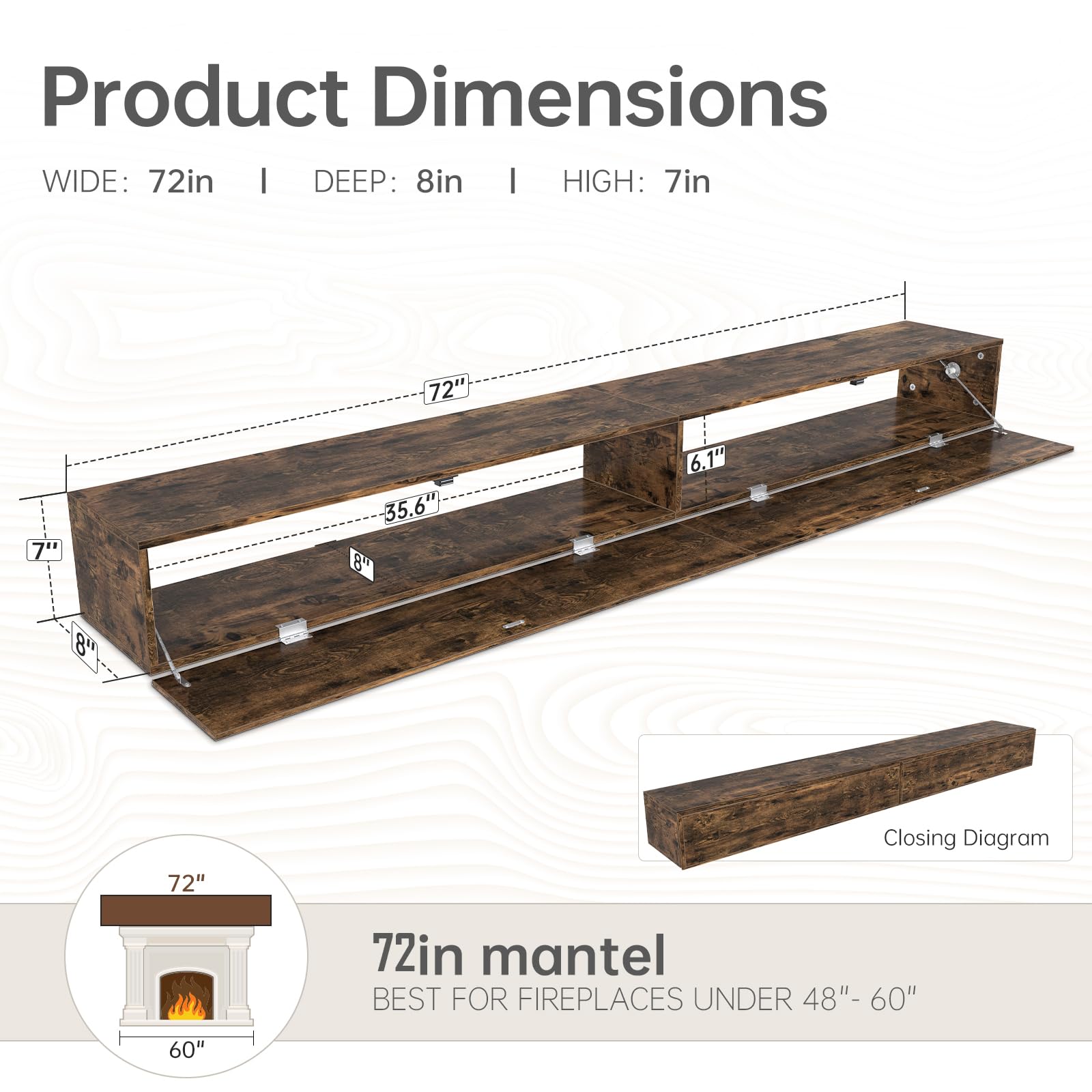 Floating Wall-Mount Style – Measuring 72 inches wide, 8 inches deep, and 7 inches high, concealed brackets provide strong support.Both hollow walls (drywalls) and solid walls (brick walls) are applicable. (It is best to have two people assist in completing the hanging of the fireplace mantel)