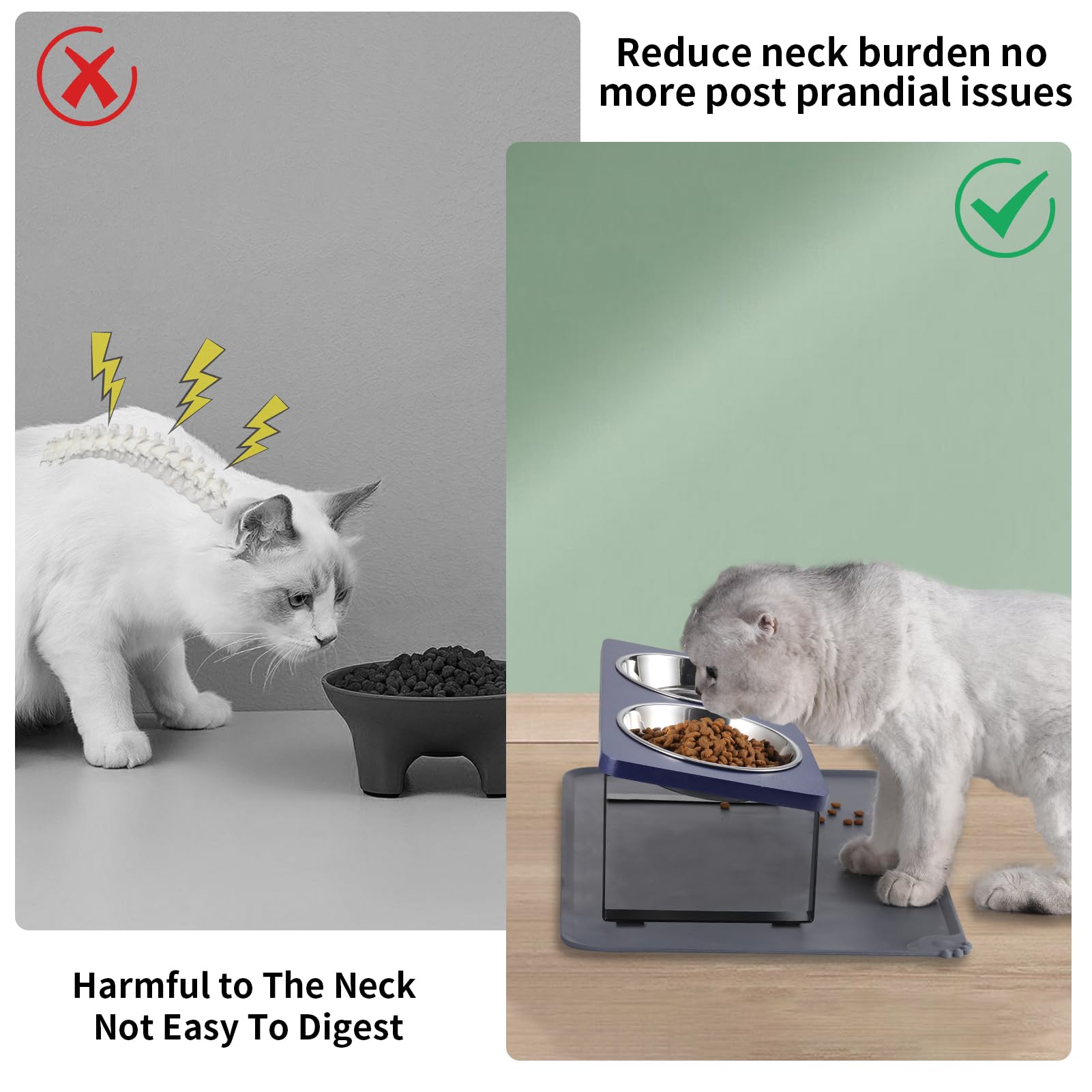 【15°TILTED Design】The 15°elevated cat bowls have been shown to be effective in relieving pressure on the cat's neck and stomach during eating, preventing vomiting and being suitable for digestion.It is more in line with the diet habits of kittens and puppies
