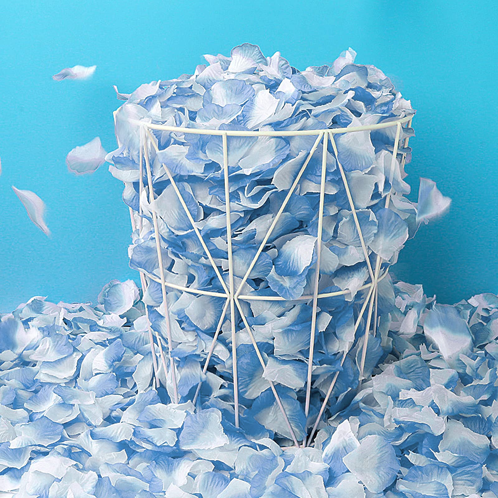 Color: Light Blue & White Features: 1000 pieces of the silk rose petals in one set will be sold together. Lifelike silk rose petals, looks like real ones but not scented Won't fade or wither - Won't affect those with allergies They work great for:Bridal showers, Partys,Weddings, Anniversaries, Celebrations,Wedding Flower Girl Baskets,Banquet,Table decoration, and much more. Can be reusable after your event.
