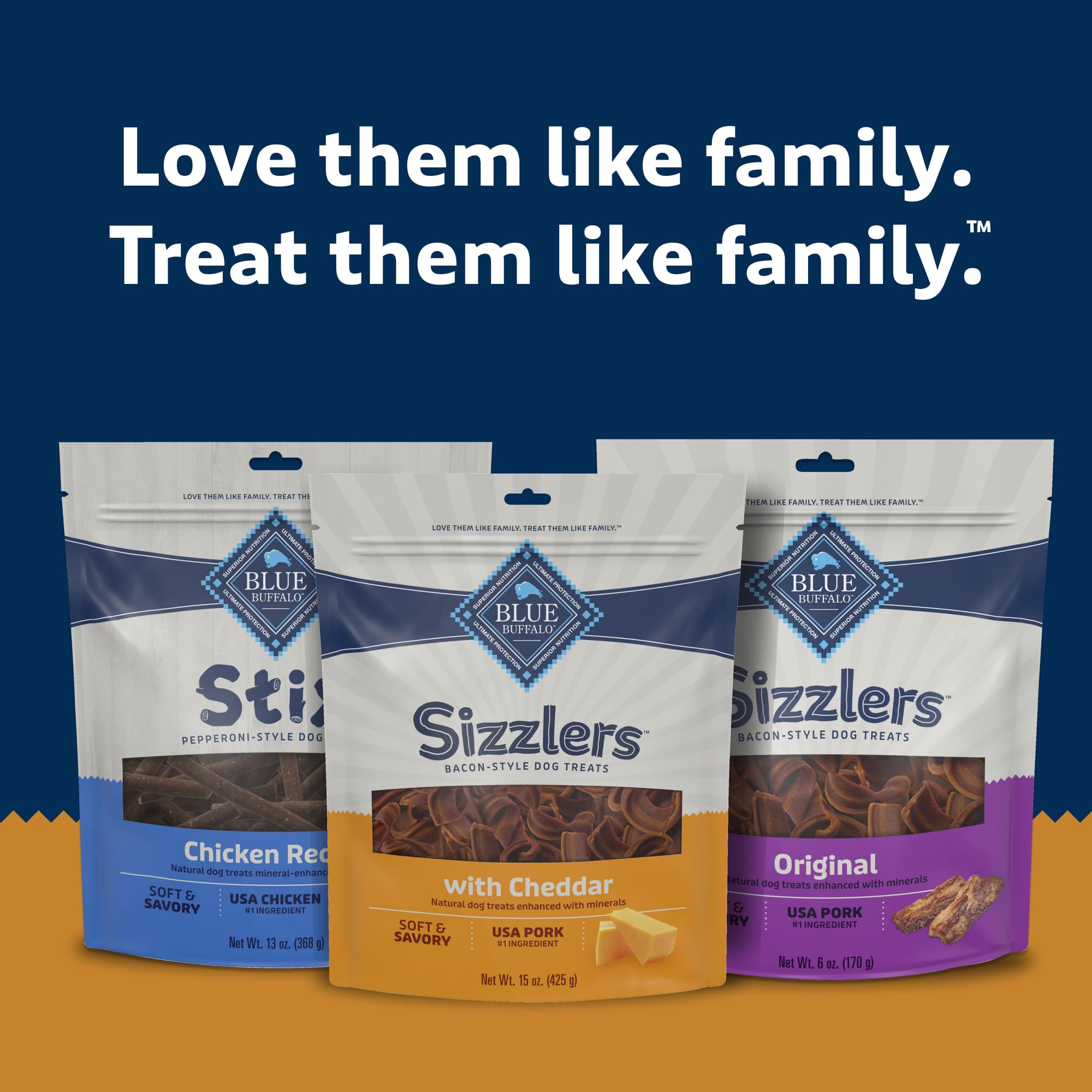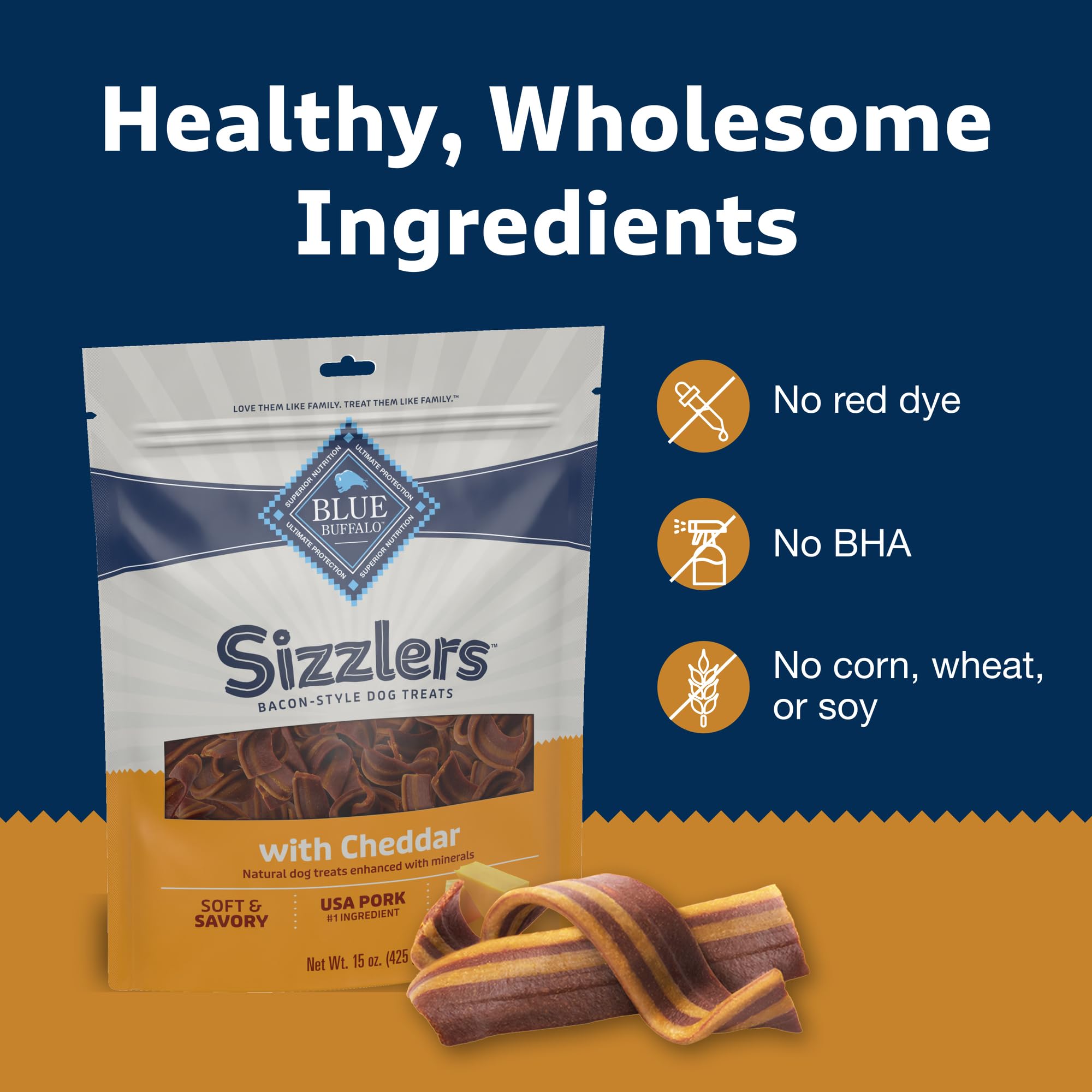 Contains: One (1) 15-oz bags of BLUE Sizzlers Bacon-Style Soft-Moist Dog Treats, Pork Recipe, Cheddar Flavor