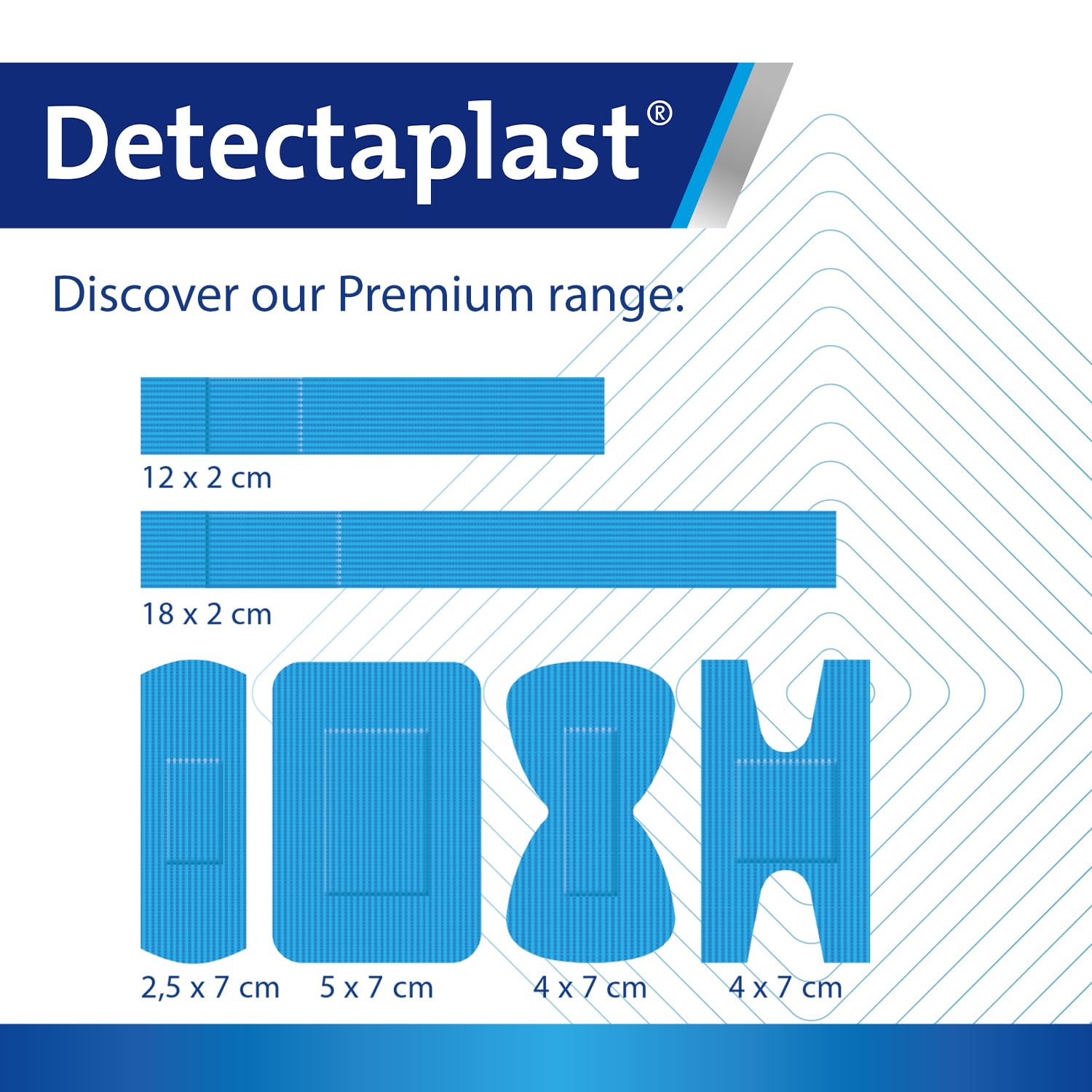VARIOUS SIZES The Detectaplast blue bandaids catering come in various sizes to be able to take care of every body area. In addition to the classic dimensions, we have long finger bandaids, H-shaped knuckle bandaids, butterfly bandaids and much more.