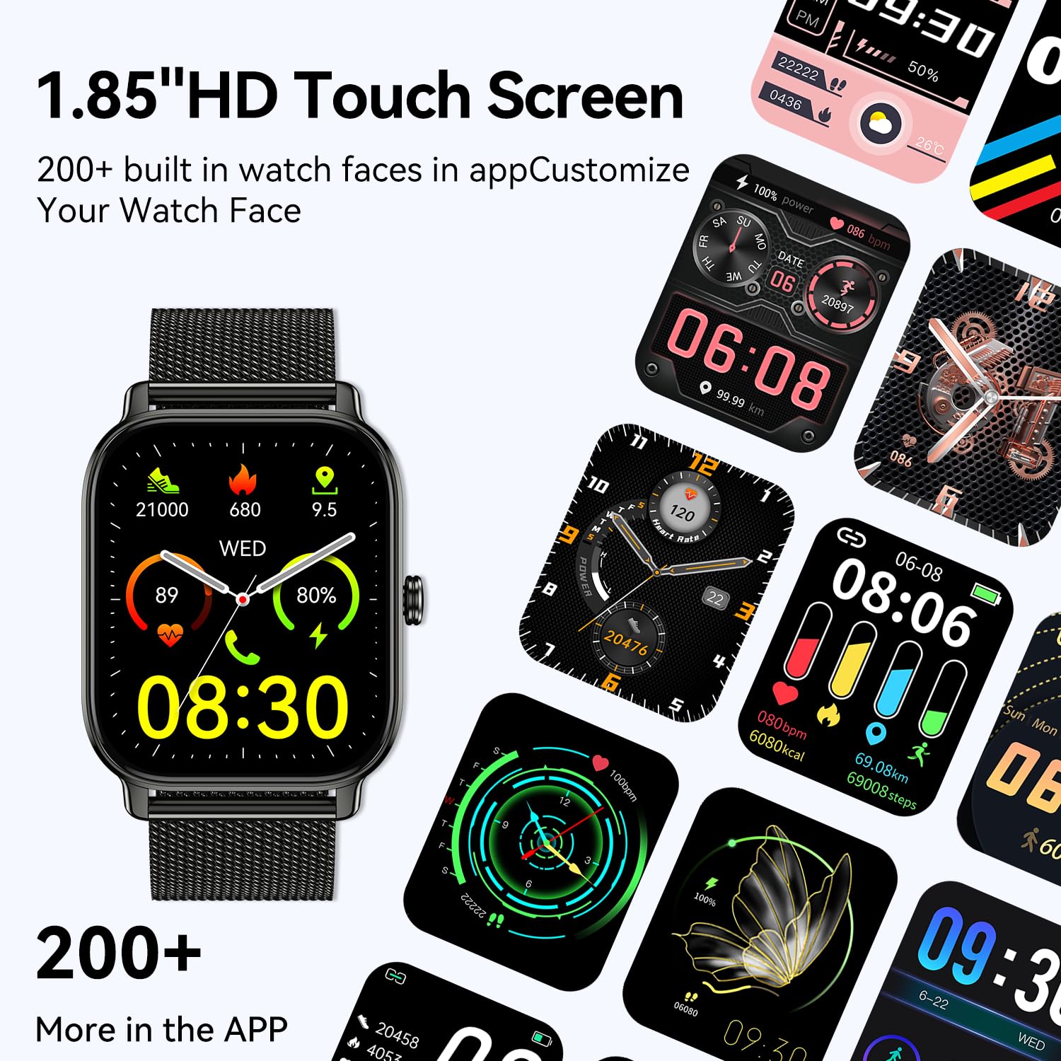 1.85” HD Display and DIY Dials: ios android smart watch feature a 1.85”HD full-touch color screen, 240×284 HD resolution, and IPS full-view technology, it delivers bright and clear visuals from any angle. With over 100 customizable watch faces—from minimalist business styles to fashionable artistic designs—you can easily match your daily look and turn a tech gadget into a fashion statement.ios android watch for men come with 2 watch straps of different colors