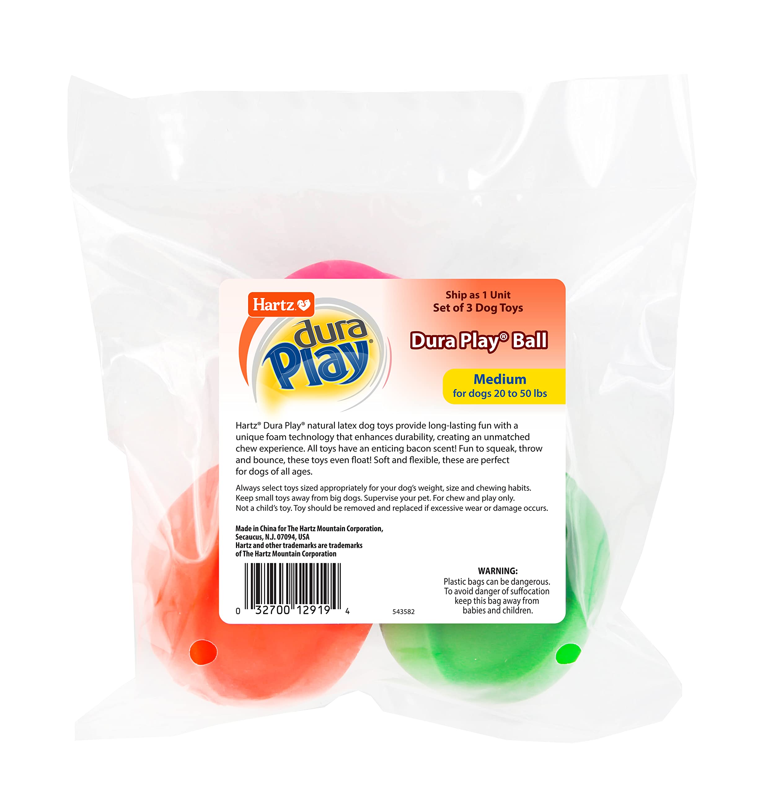Whether your dog enjoys indoor or outdoor play, Hartz Dura Play bacon scented dog toys are the perfect addition to the toy bin. These dog toys have a durable exterior coupled with a lightweight foam interior to make it easy to throw, bounce, squeak, and float! Every shape has an ear-perking squeaker and an appealing bacon scent that will have even the most inactive dogs begging for more playtime. Dura Play dog toys are perfect for dogs of all ages – the flexible yet durable exterior lends itself to more than just a fetch toy. After your pup is worn out from his or her active play, Dura Play also has unique shapes with ridges that double as a soft chew toy. Be sure to try all the different shapes for hours of enticing play and fun for both you and your furry best friend!