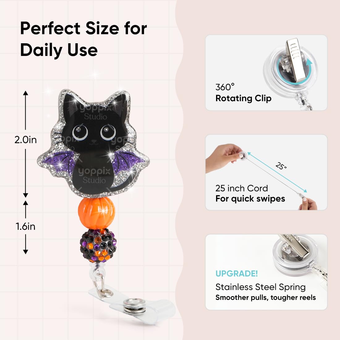 YOPPIX Halloween Bat Badge Reel, Nurses Funny Sparkly Glitter Retractable Badge Reel for Nurses RN EN Doctor Paramedic Teachers Medical Office Womens