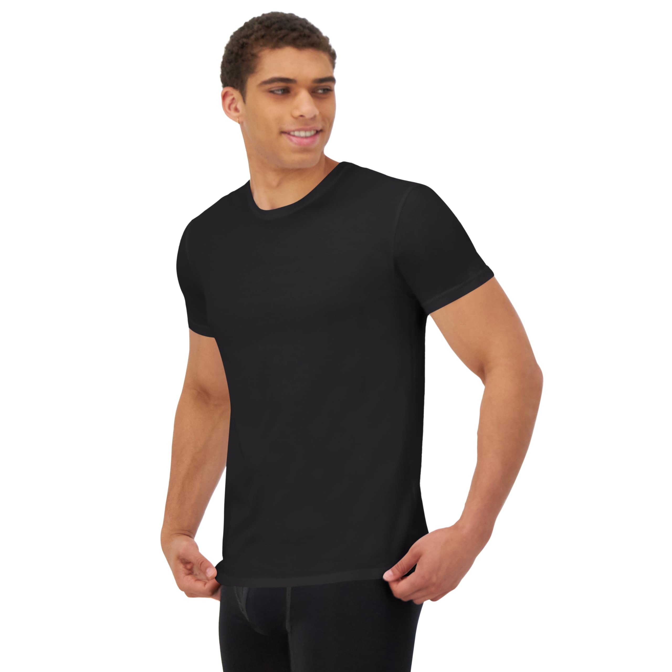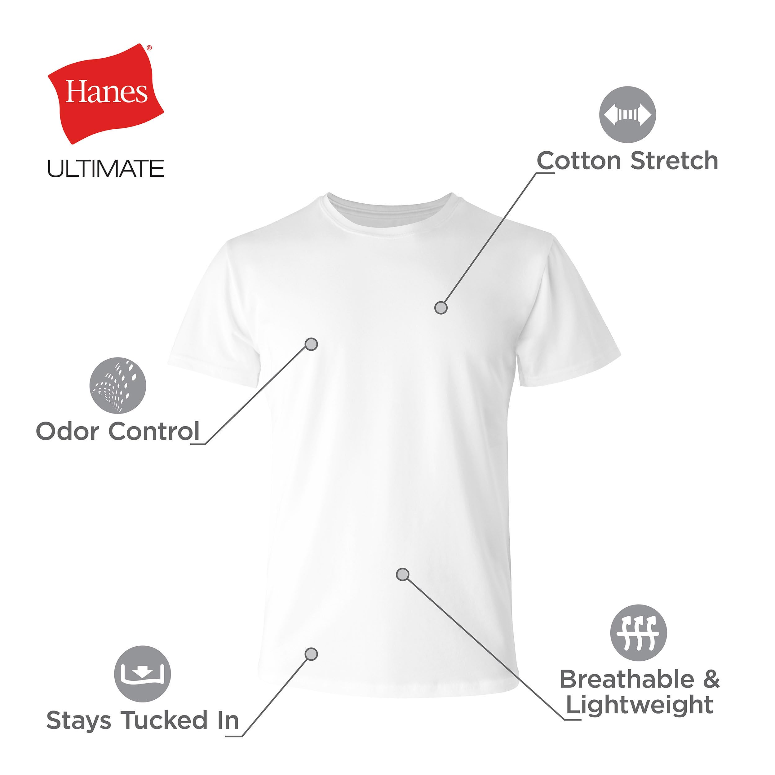 Description Hanes Ultimate® Comfort Fit stay-tucked t-shirts are crafted from lightweight, breathable ringspun cotton that includes just a touch of spandex for stretchy, move-with-you comfort. The moisture-wicking fabric features anti-odor technology, keeping you cooler and fresher all day long. The classic crewneck design stays tucked in for the perfect fit under shirts. No need to worry about irritating tags, thanks to the smooth Tagless® interior. This men’s undershirt comes in a convenient 4-pack, so you can always keep a fresh Hanes tee on hand.