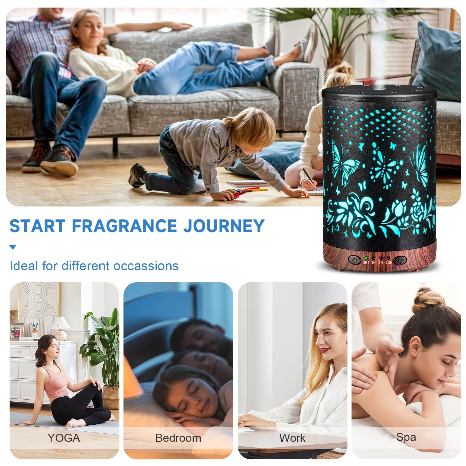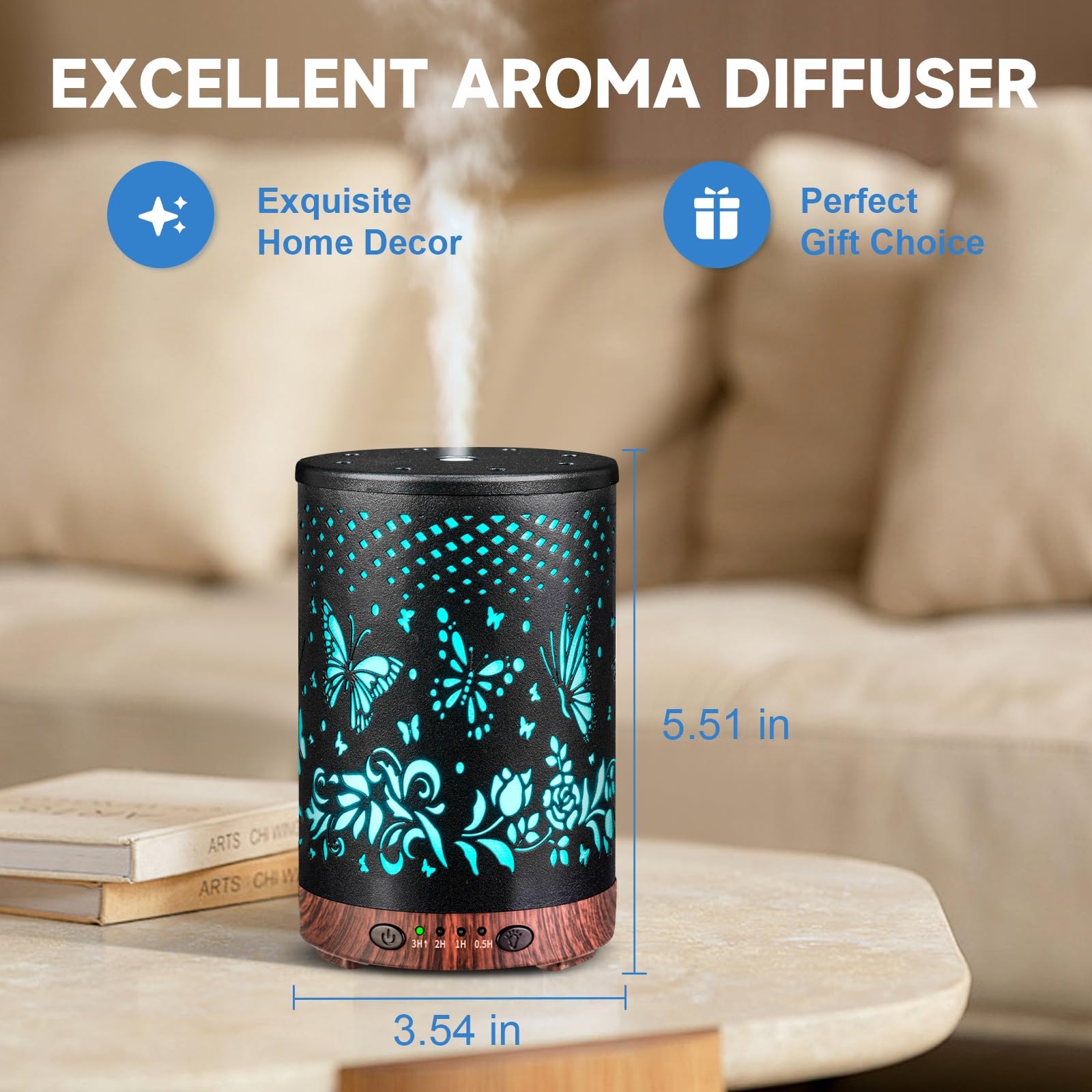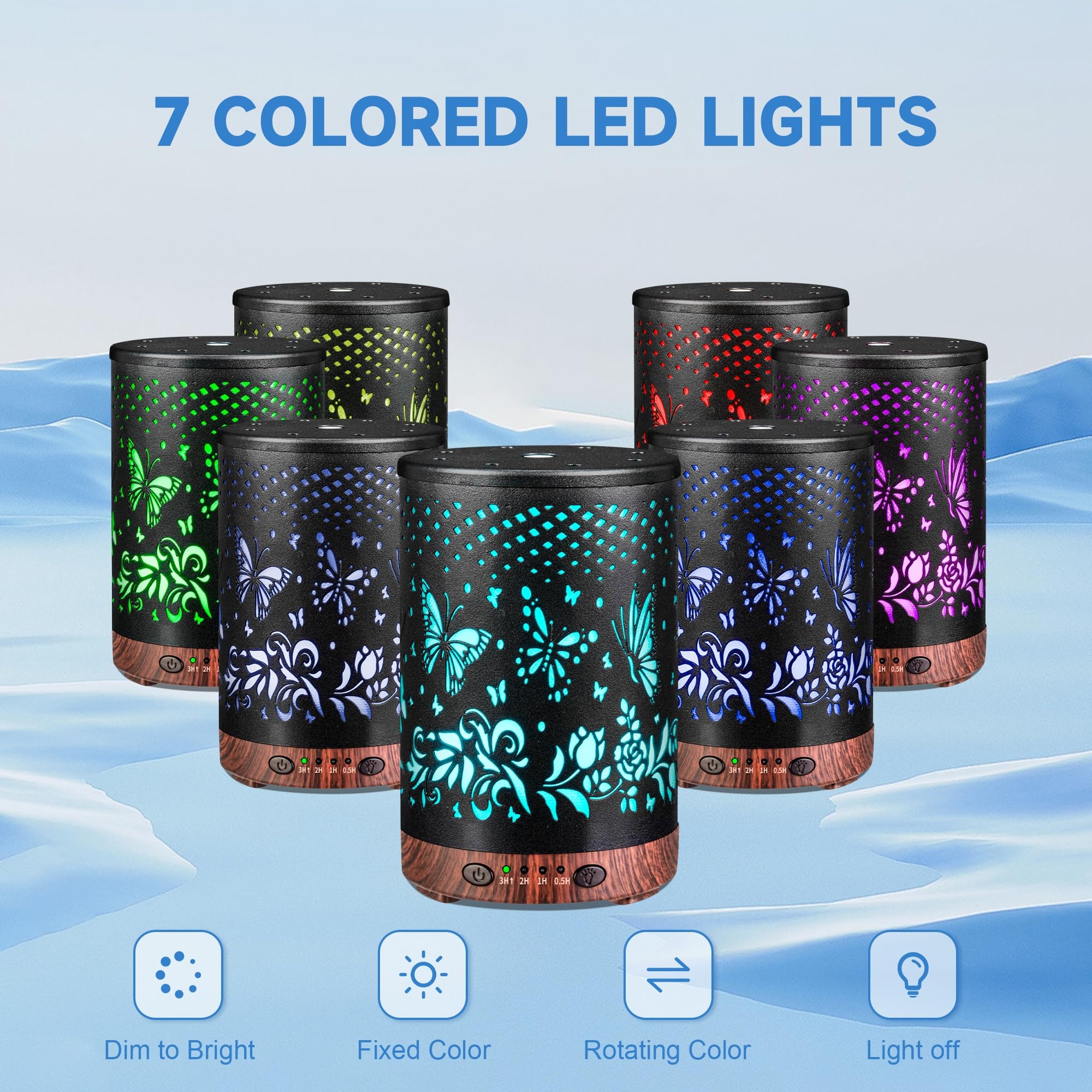 Appealing Design: Exquisite metal exterior with classic pattern. This metal diffuser perfectly aligns with simple, minimalistic, modern and contemporary decor styles. Featuring 7 color LED lights, each with bright and dim options, the air diffuser allows you to choose your preferred color mode or rotating colors. It's perfect for any setting, adding a touch of elegance to any space.