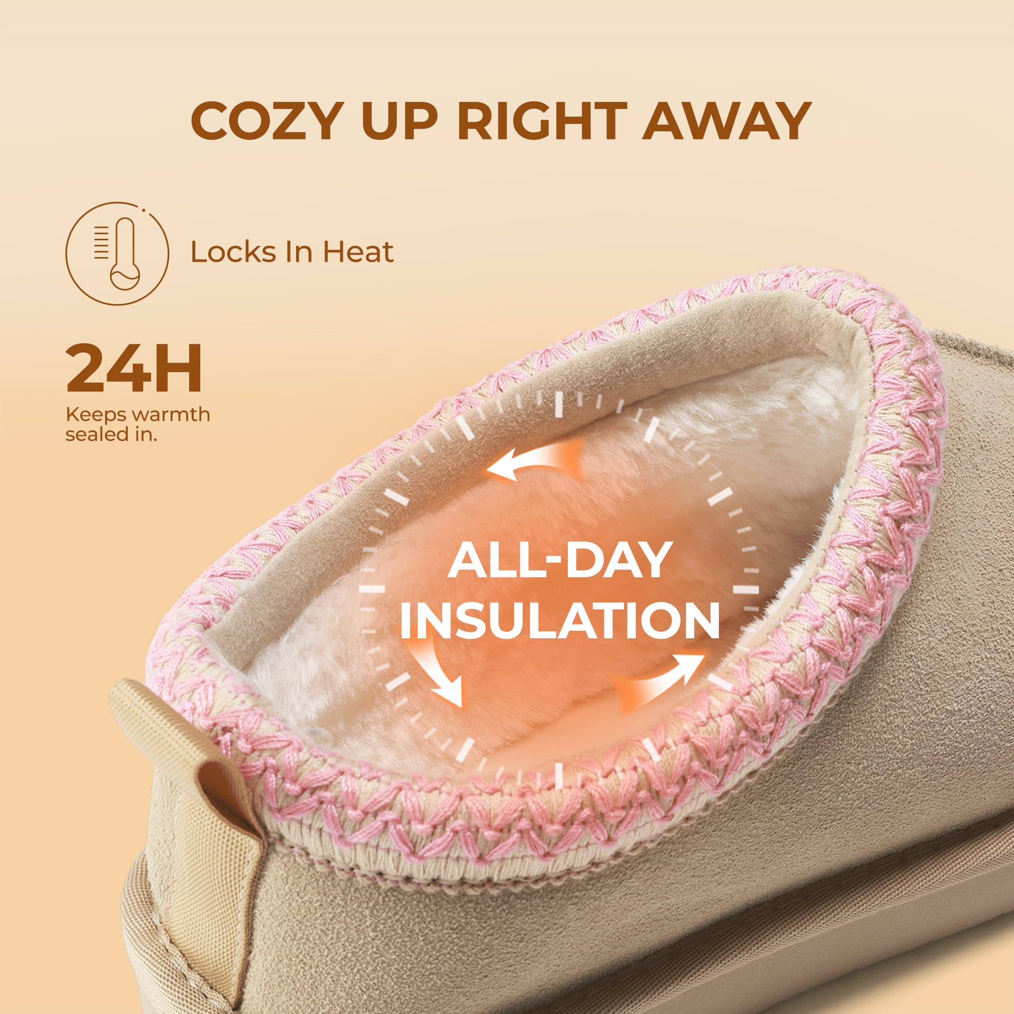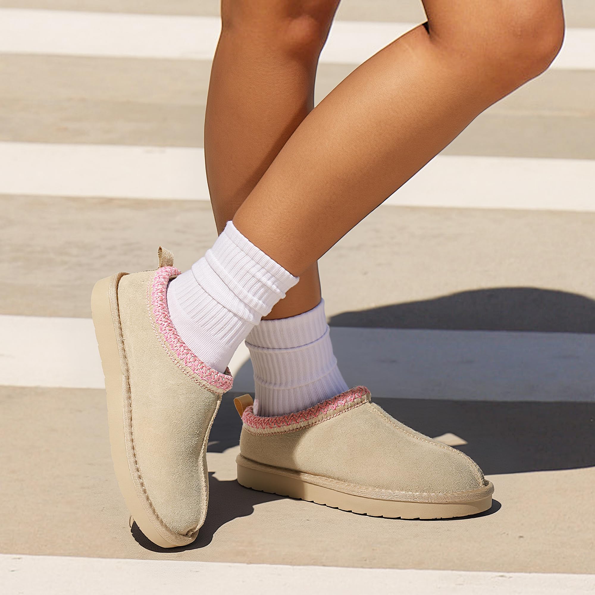 Supportive Insole: These suede leather slippers are made with faux fur-covered latex and foam insoles that offer support and added warmth. With arch support, these cute slippers reduce foot fatigue when standing and walking for long periods.