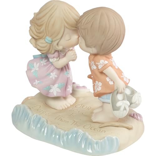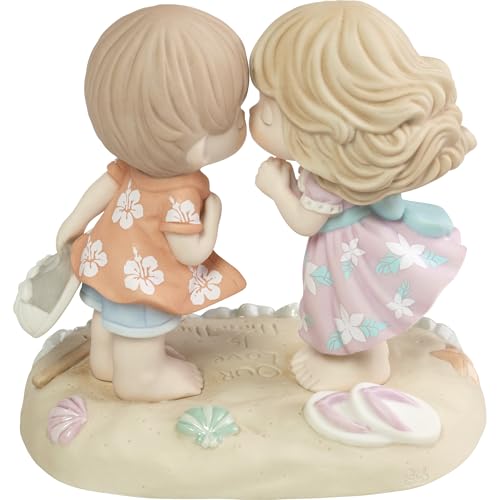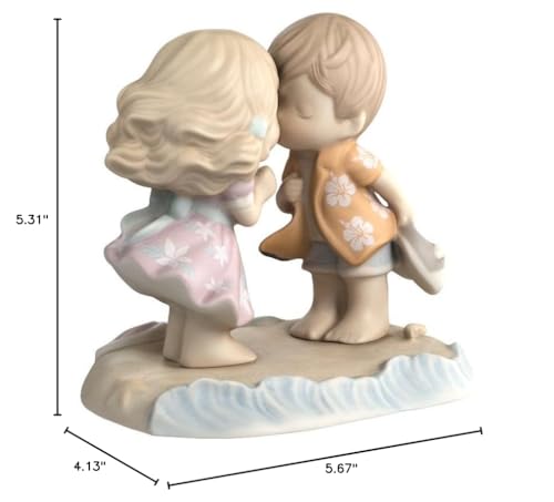 Preparing for a romantic kiss on a windswept beach, this sweet duo enjoys the ocean breeze and a cozy moment by the sea. They’ve etched a beautiful message in the sand beneath their bare feet. Inspires fond memories of shared adventures and romantic vacations. Couples that enjoy tropical adventures will just love this adorable figurine. Give this beautiful gift to your sweetheart or to a couple for anniversaries, weddings, birthdays, holidays, or ‘just because’. This is a great gift for a collector too. Meticulously crafted in fine bisque porcelain and expertly hand-painted. Approximately 5.5H x 5.75W x 4.25D inches.