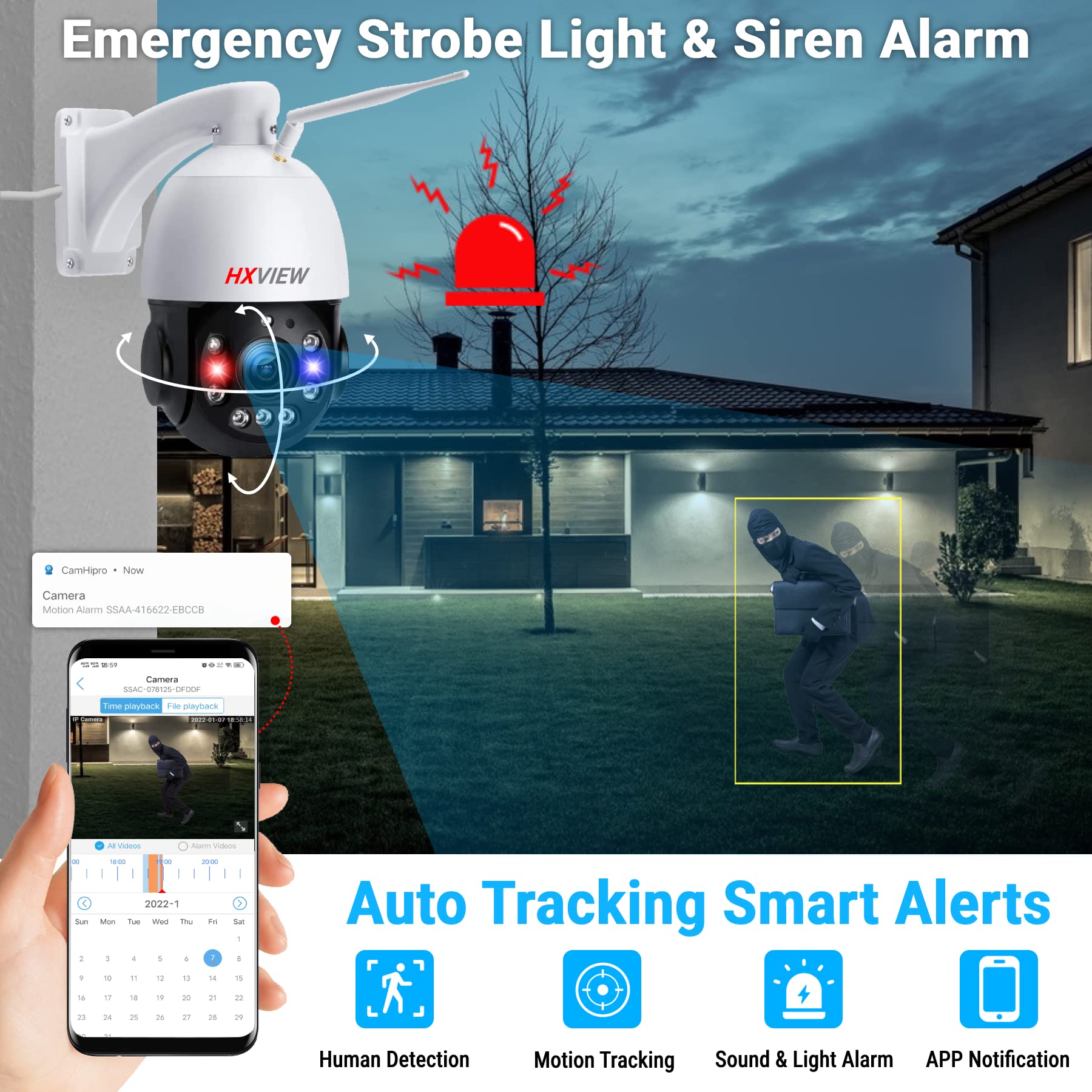 Remote Access & Two Way Audio: Compared with traditional cameras, this security ip camera transmits audio/video via wifi, which saves the expensive cable cost and installation cost of CCTV. Just add the camera through the free "CamHipro" APP and set up wifi for the camera, you can remotely watch real-time video anytime and anywhere, and you can also talk to people near the ptz camera outdoor. (The ptz security camera only supports 2.4GHZ WiFi, not 5GHZ WiFi)