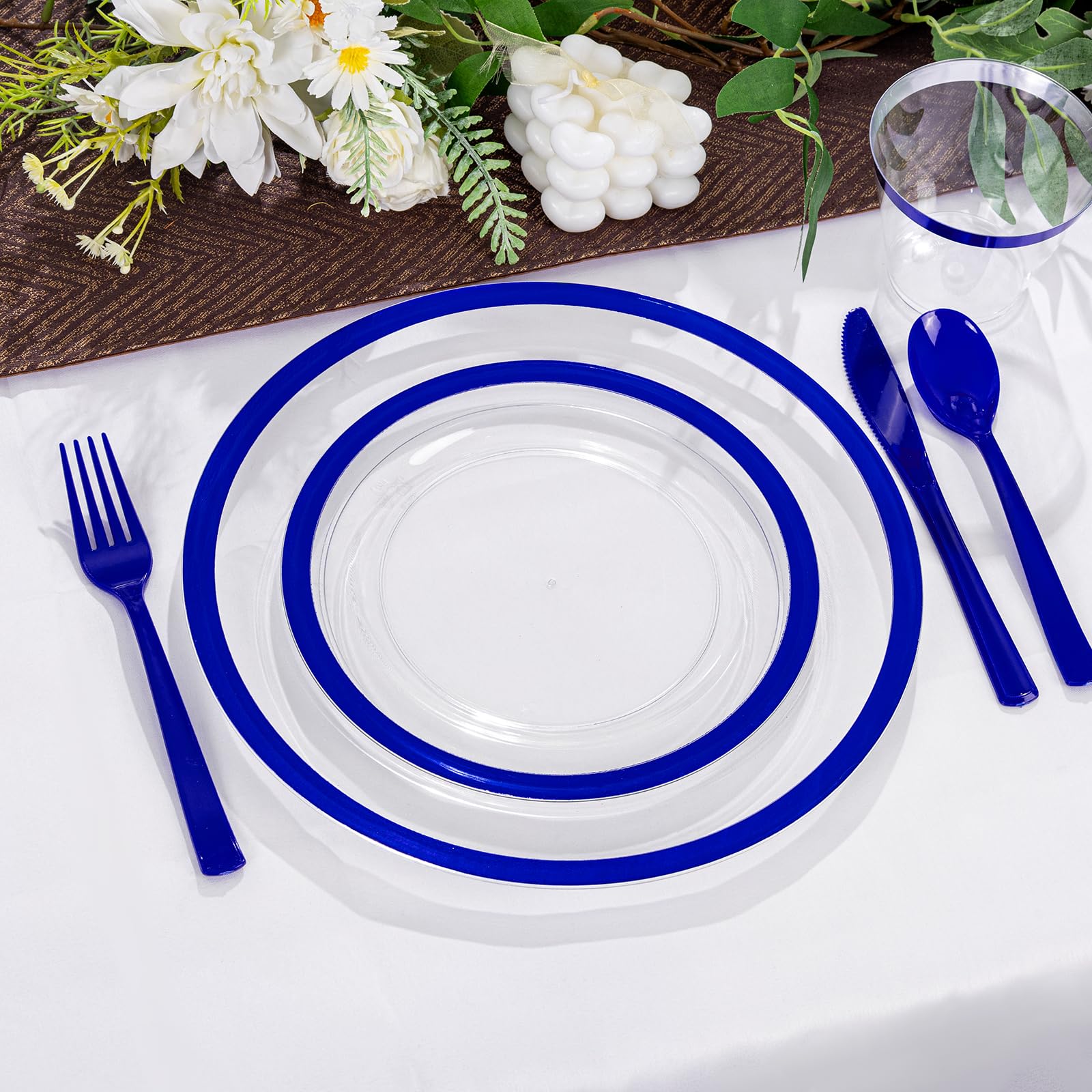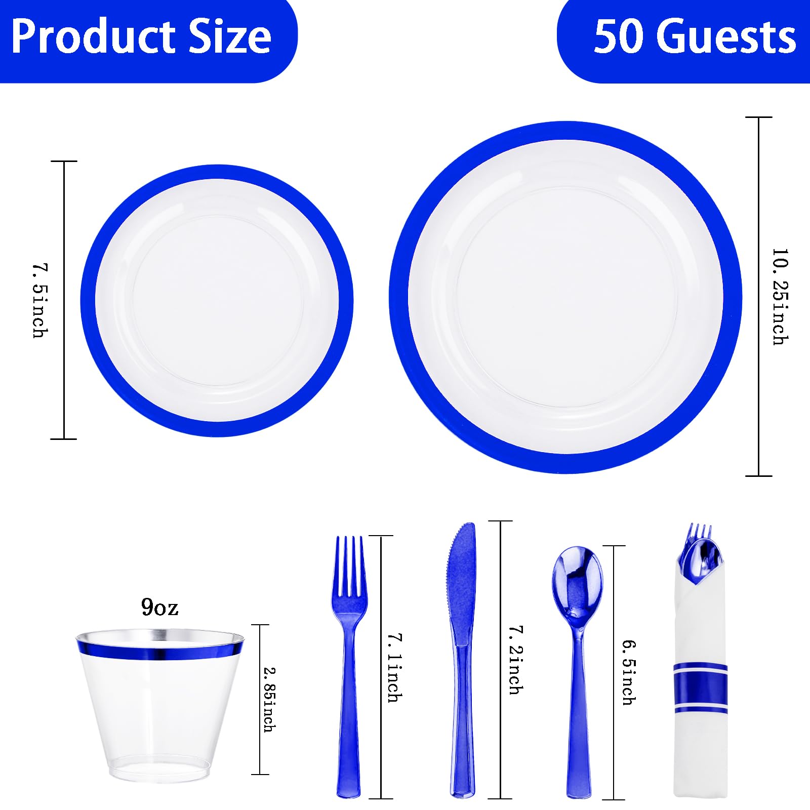 Elegant Design: The blue disposable dinnerware set are designed with transparent serving plates with blue round rims, they look elegant, luxurious. They match your party decorations very well and will be the icing on the dinner.