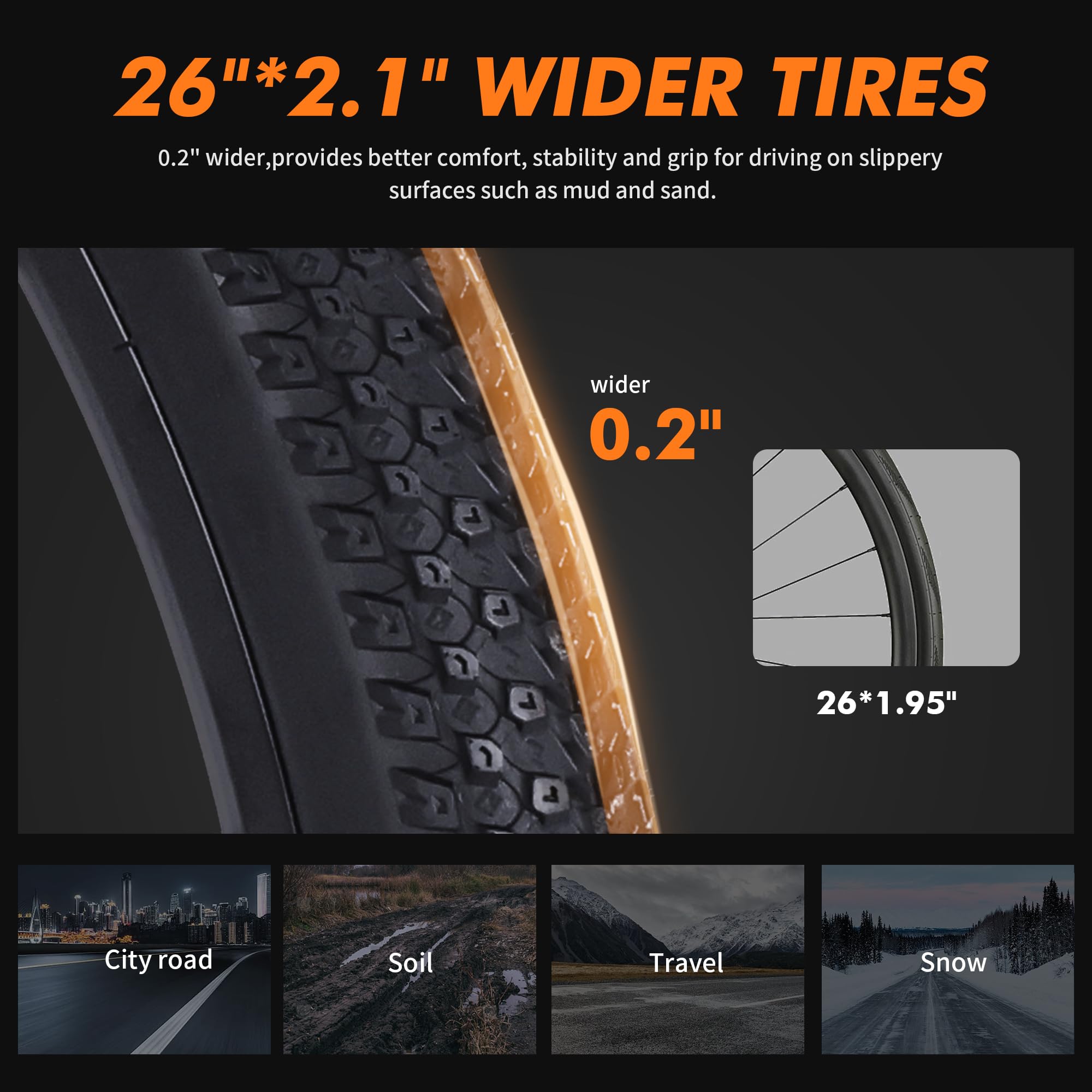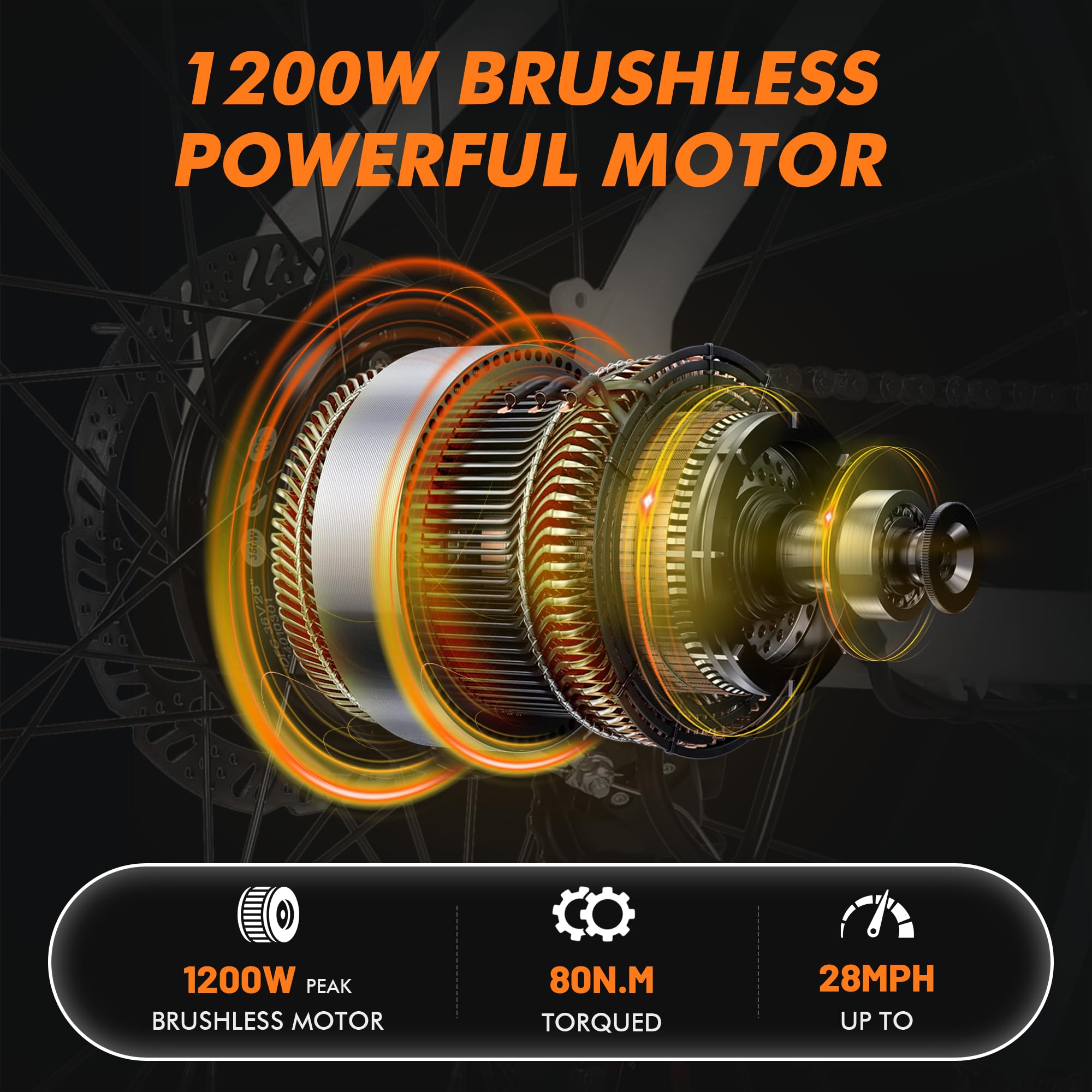 The youthful and stylish commuter e-bike features four riding modes, including a peak Peak 1200W brushless motor, reaching speeds of up to 28 MPH, 26''X2.1 tires. In addition to manual, pedal-assisted, and pure electric modes, a walking-assist mode has been added to cater to the needs, enabling easy navigation through various terrains, including hilly areas, for commuting, traveling, and sightseeing.