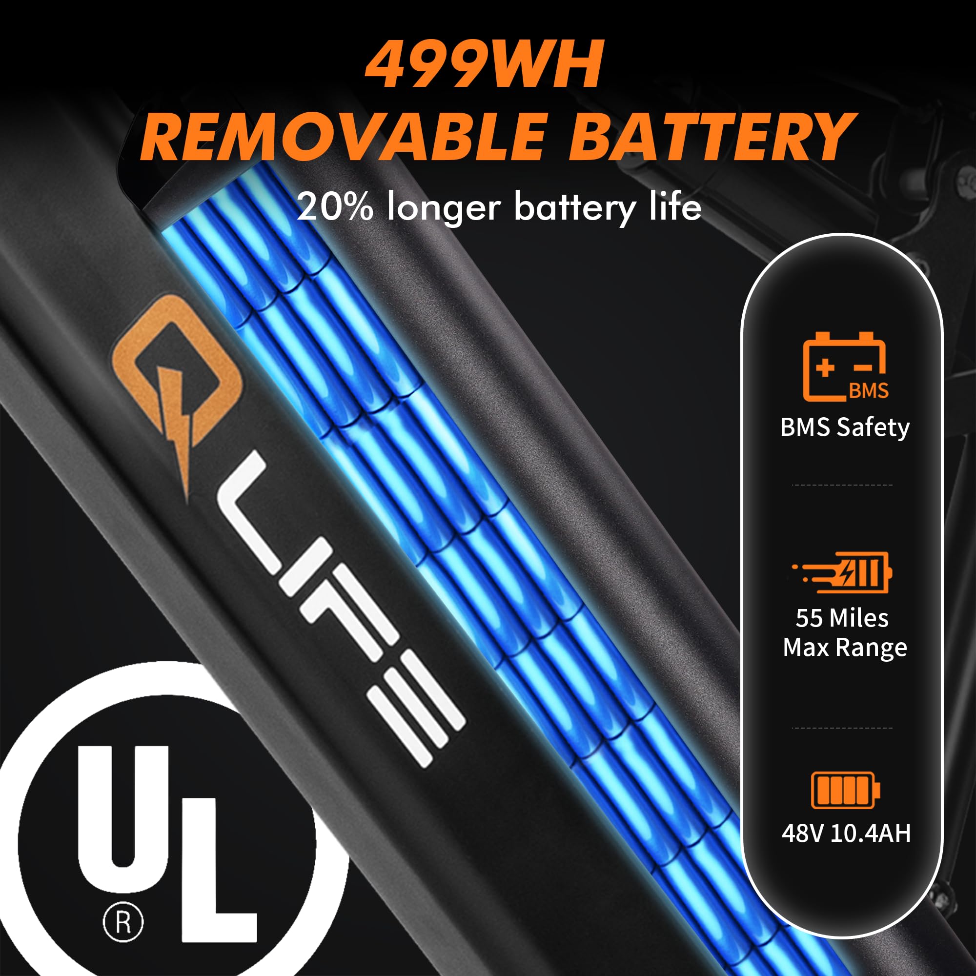 48V 10.4Ah UL2849-certified Battery - Easily removable for charging, this battery boasts a waterproof, and anti-theft design with key, meeting the stringent safety standards. It provides an impressive range of up to 30 miles (throttle) or 45 miles (PAS) on a single charge. Tailored to enhance your everyday adventures, ensuring you can explore without limits.