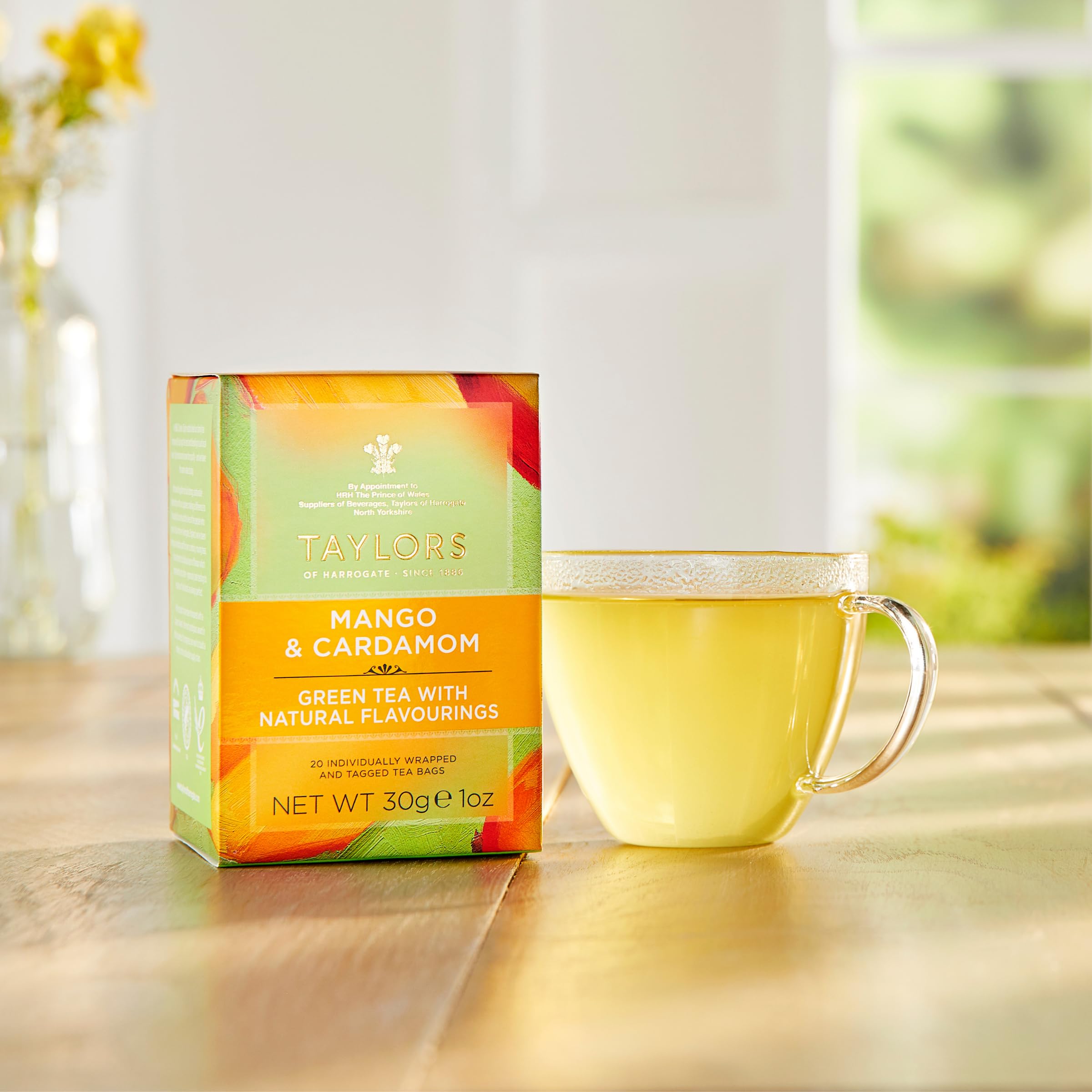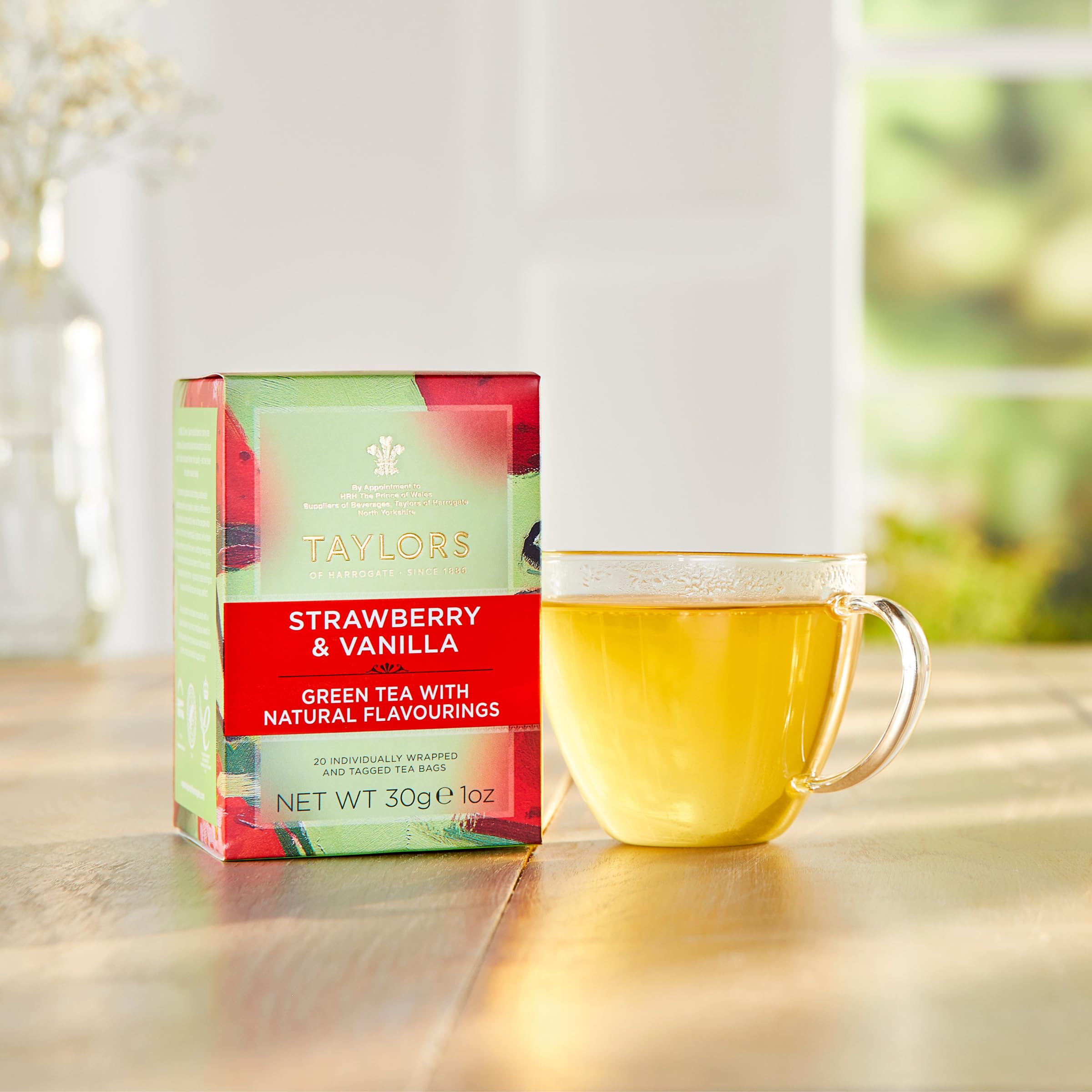 Taylors of Harrogate Green Tea Fruit Infusion Variety Pack includes three flavors: Strawberry Vanilla, Peach Hibiscus & Mango Cardamom.