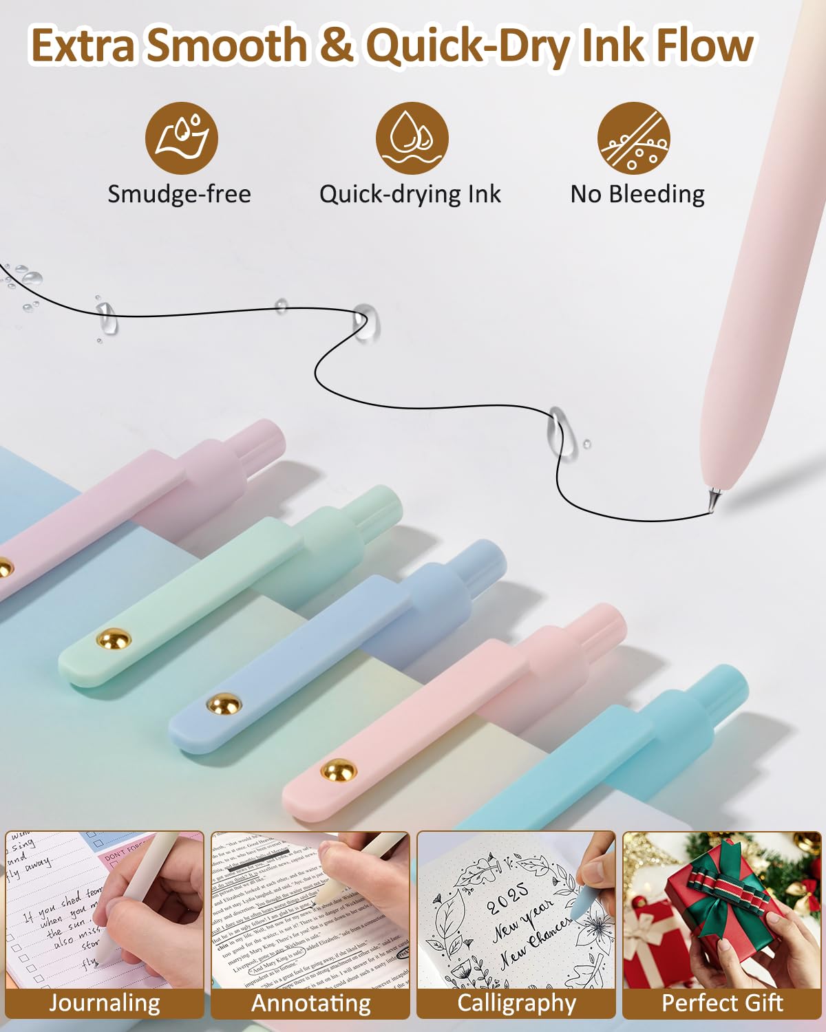 Quick Drying Ink:12Pcs high-quality gel pens feature reliable ink that won't fade or smudge easily. Quick-drying ink with a large capacity ink compartment keeps the paper clean and does not leak, providing you with long-lasting writing time. These black ink pens are also suitable for lefties