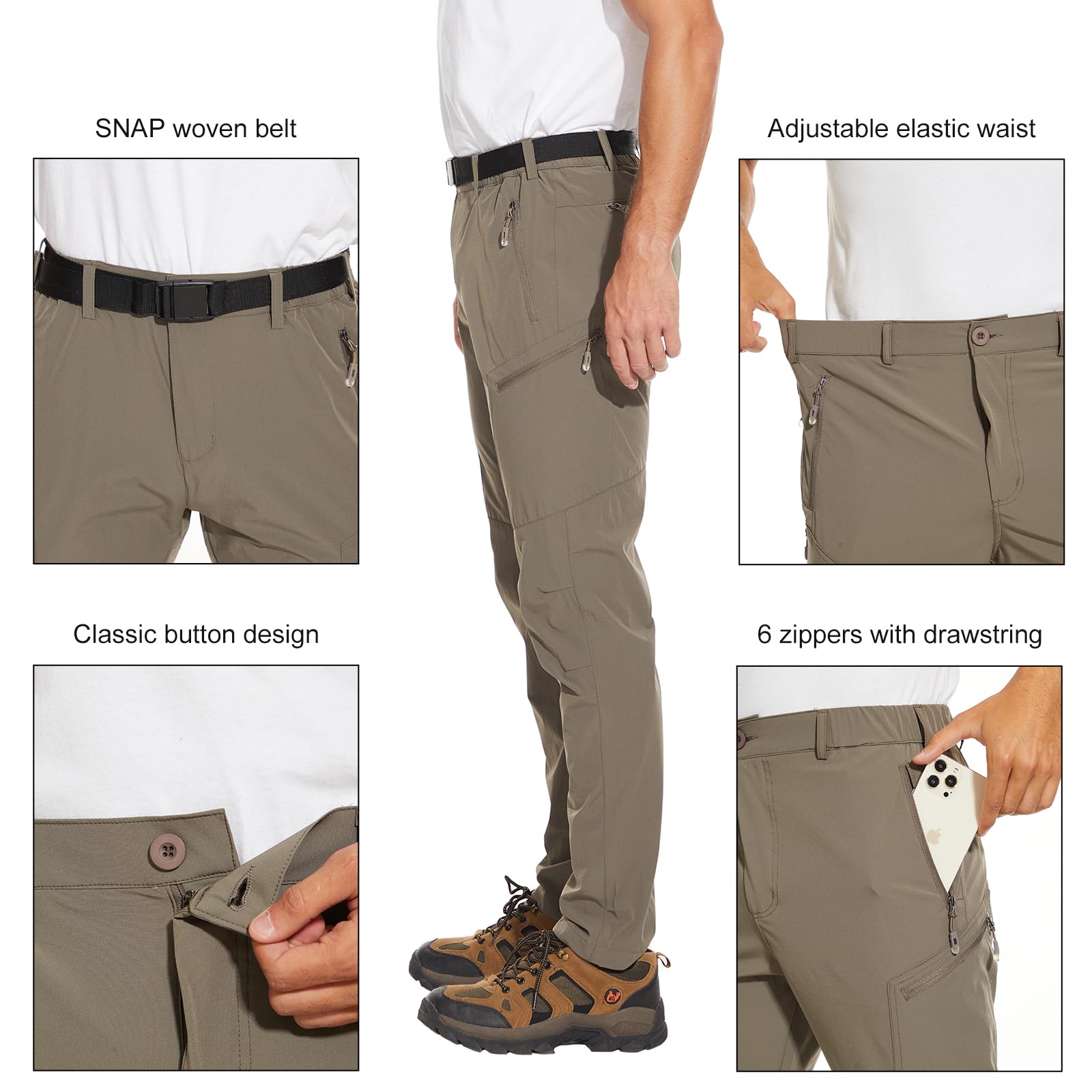 【6 Large Zipper Pockets】:The 6 practical zippered pockets with drawstrings on the water resistant hiking pants for men provide you with plenty of storage space. The 2 large leg pockets are ideal for holding your phone, wallet, or other necessities, while the 2 side pockets are made to keep tiny items safe and secure. For larger stuff, there are 2 additional back pockets. Travel pants for men ensure the security and safety of your possessions.