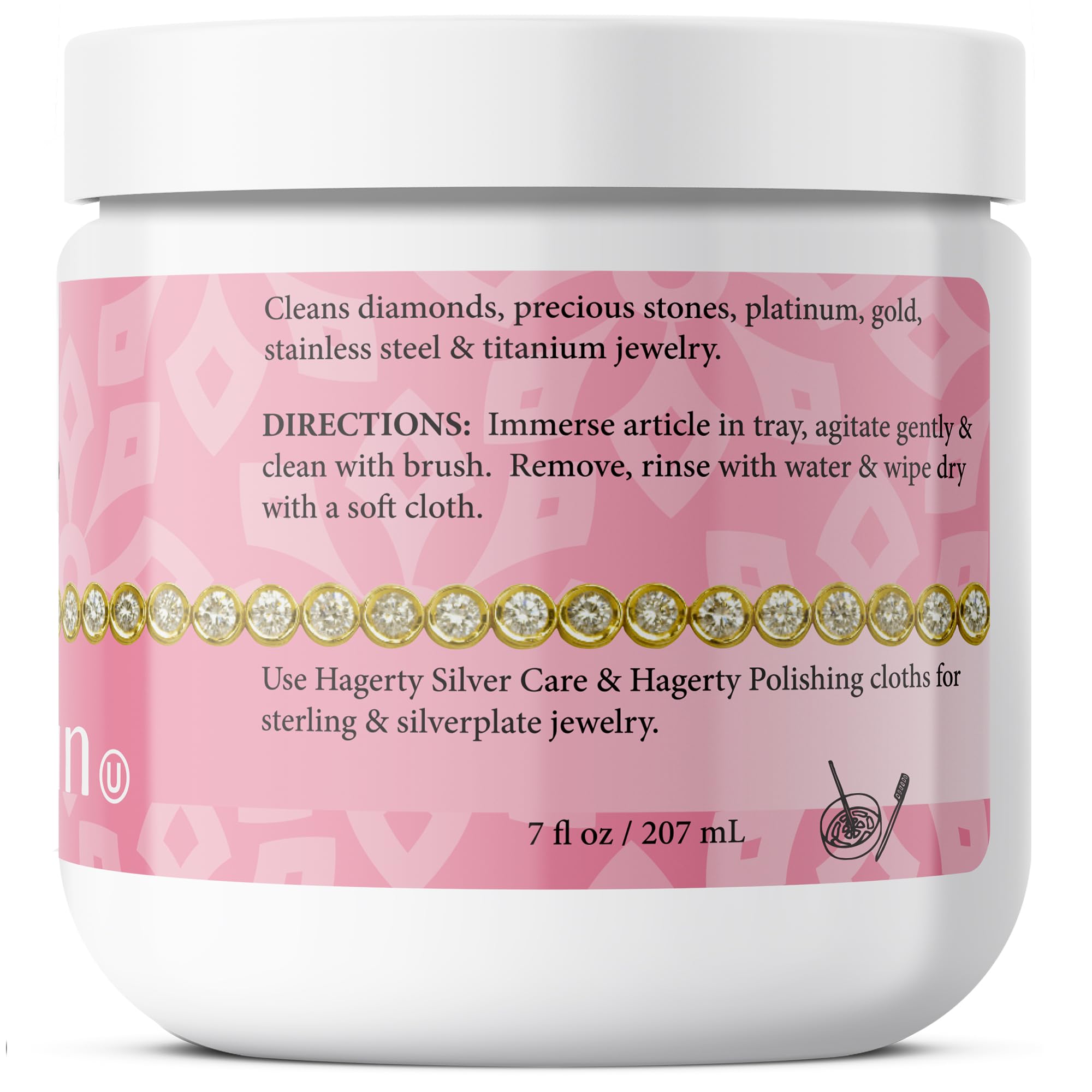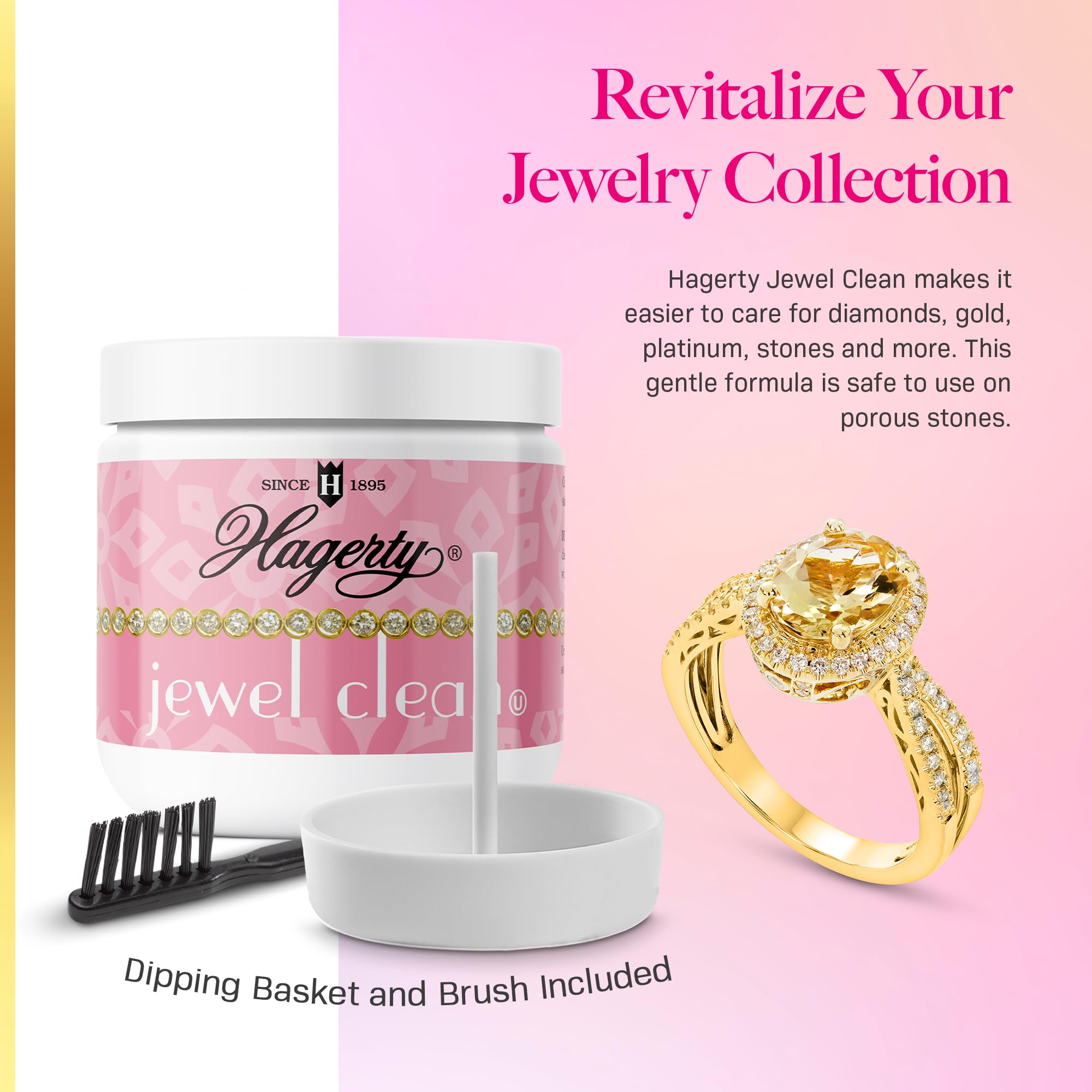 Caring for the world's treasures since 1895. Hagerty Jewel Cleaner is made to meet the highest professional jewelry cleaning standards. It's engineered to keep diamonds, precious stones, platinum, gold, stainless steel, titanium, and all fine jewelry looking their absolute best. It's safe on porous stones, ensuring that your most delicate gems receive the gentle care they deserve. Our Jewelry cleaner kit includes everything you'll need. A dipping basket and jewelry brush are included, making the entire cleaning process a breeze. Hagerty Jewel Clean is also ammonia-free and fragrance-free. Say goodbye to those unpleasant odors and hello to a refreshing cleaning experience. Note: Jewel Clean is a liquid jewelry cleaner, not a polish. To remove tarnish, we recommend using Hagerty Jewelry Polishing Cloth for a final touch of brilliance.