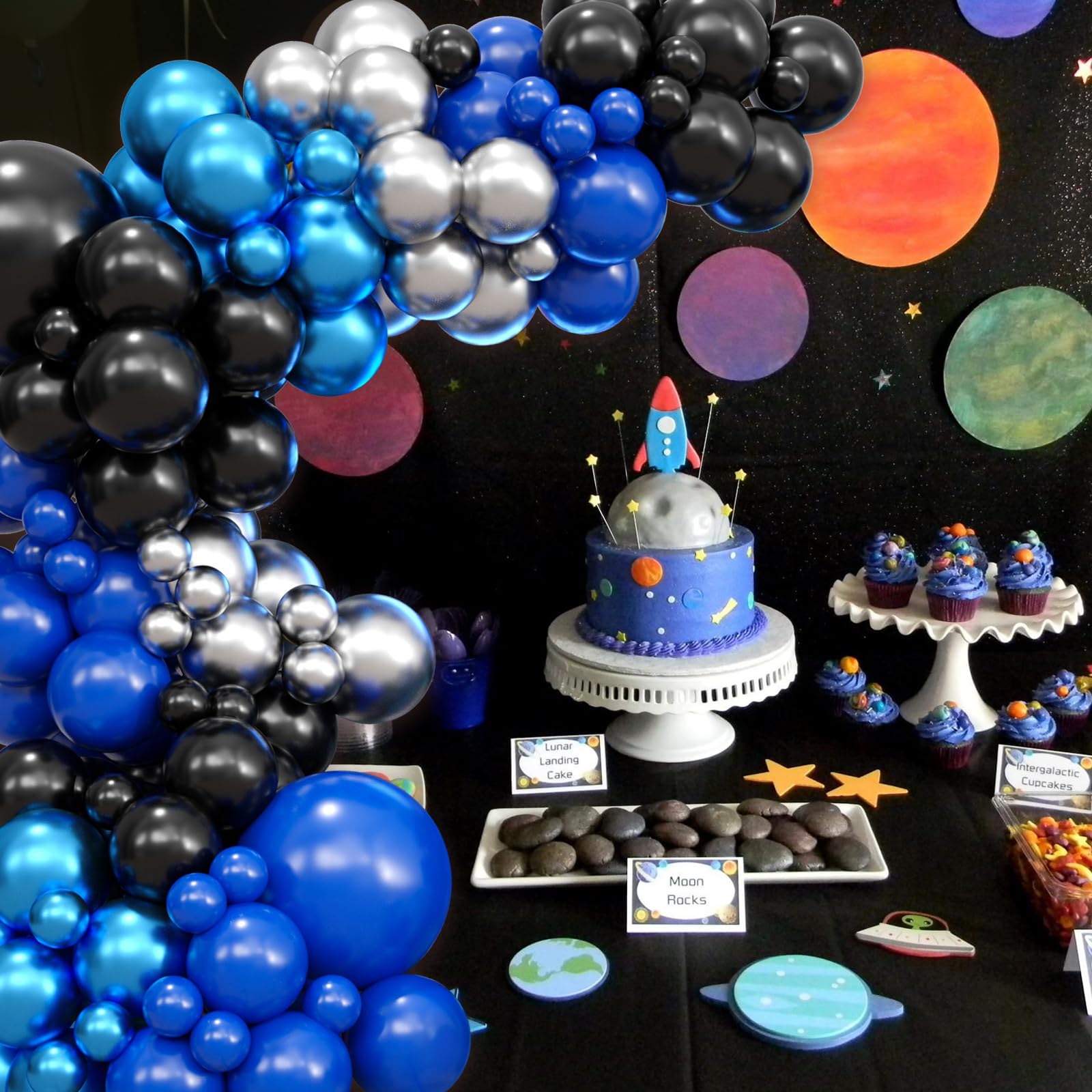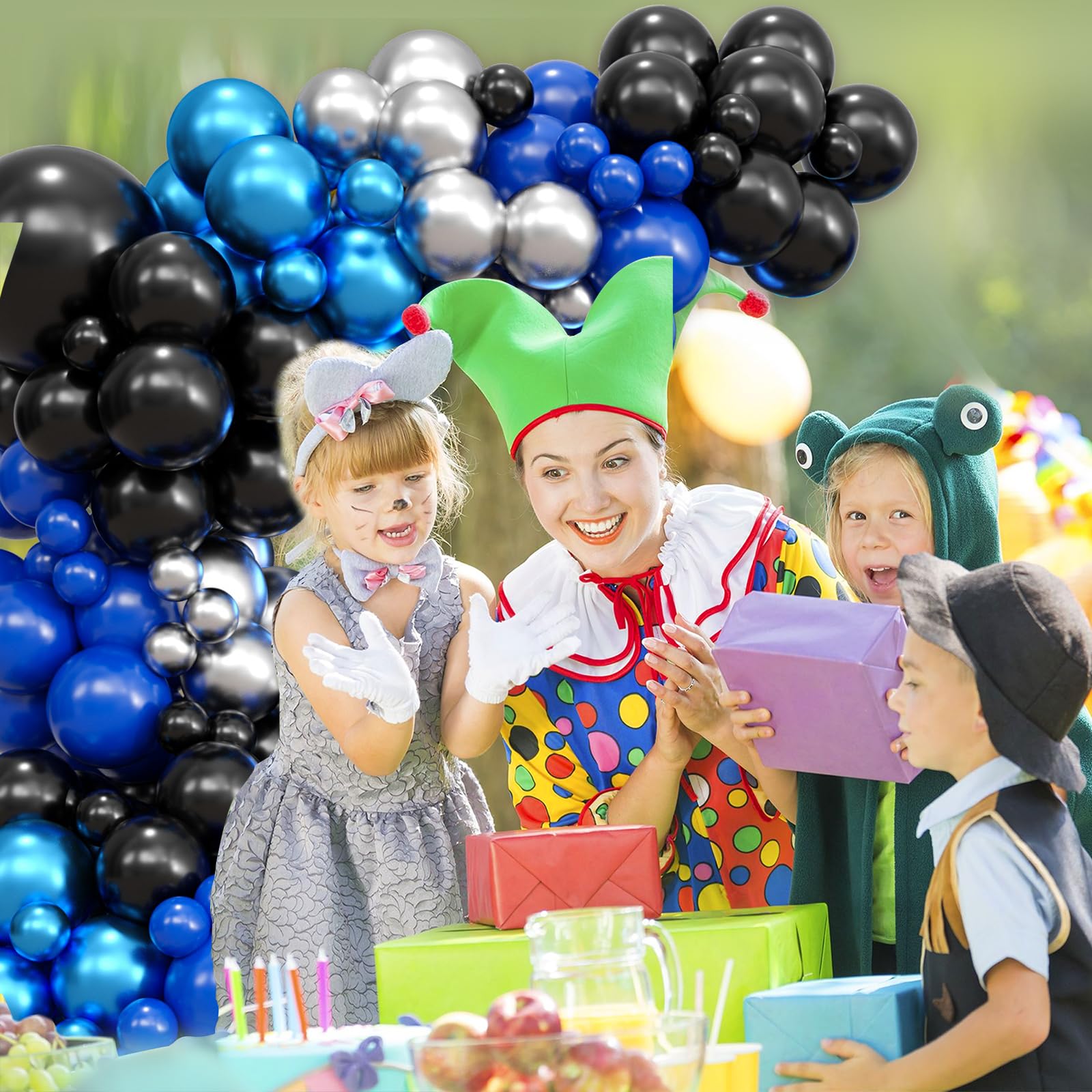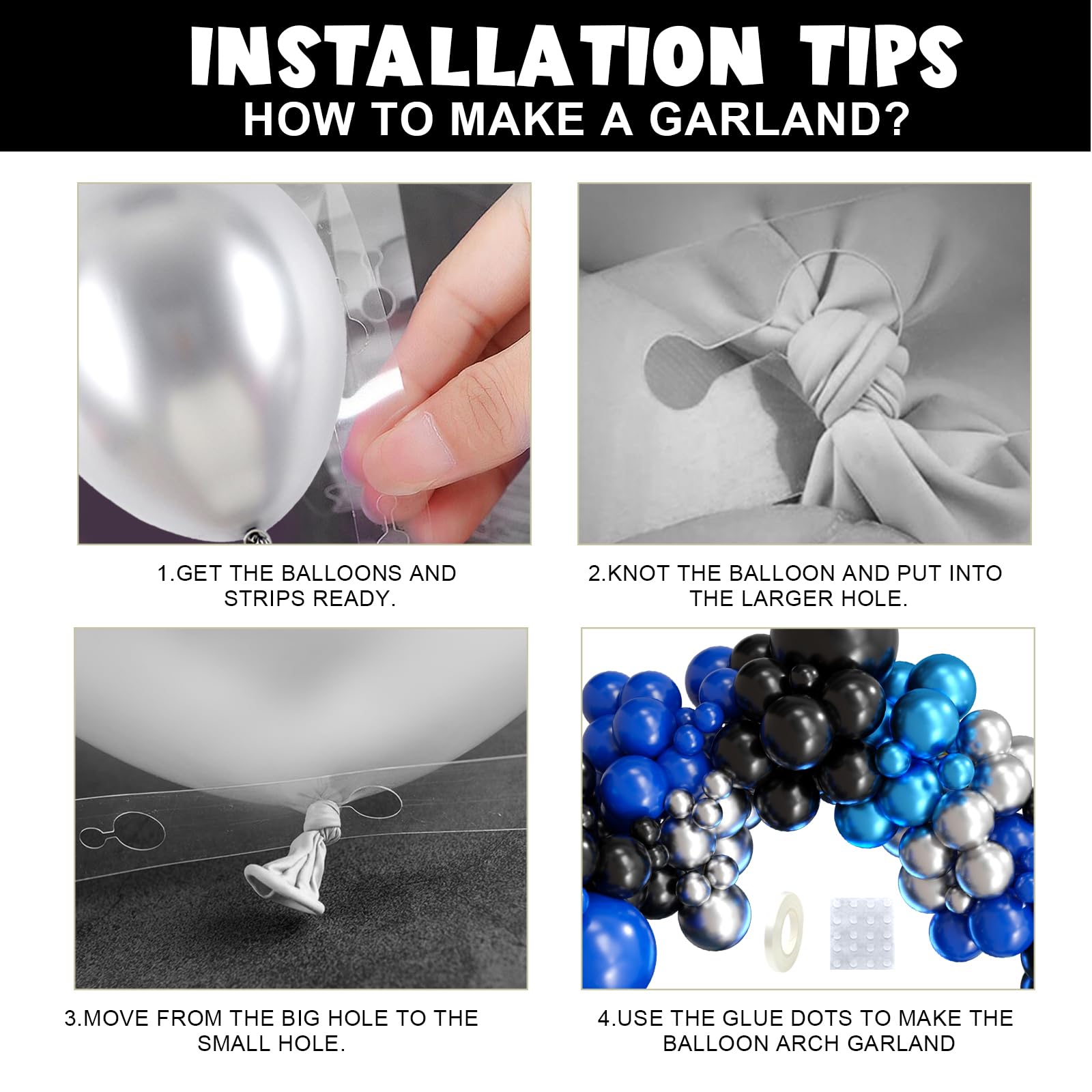 Black Blue Balloon Garland Kit: The black blue silver balloons arch kit included dark blue, black, metallic silver, metallic blue balloons for size of 5, 10, 18 inches. Equipped with 1 white ribbon, 1 roll balloon chains, 2pcs dispensing adhesive. With this balloon garland kit, you can create the great balloon garland for any event.