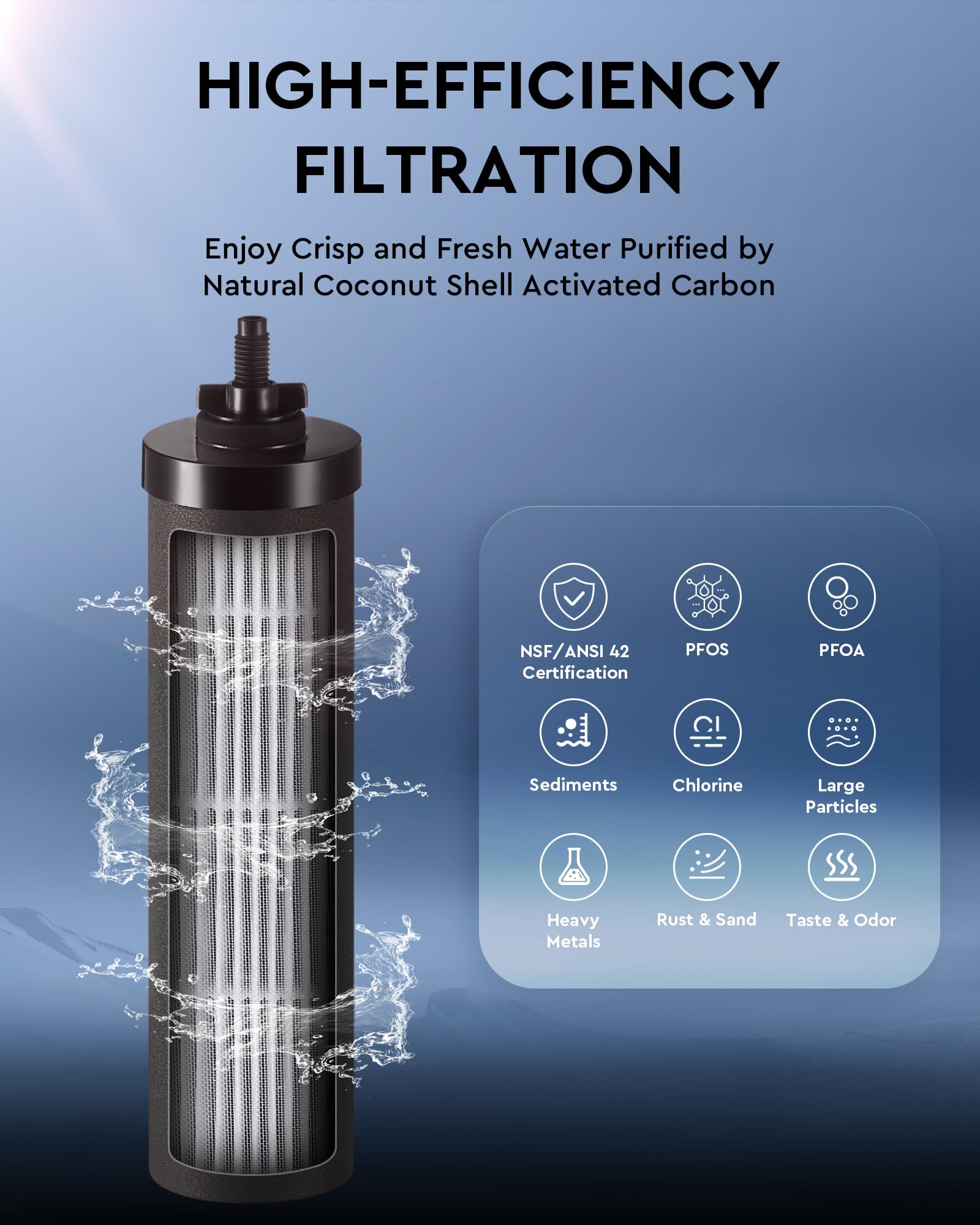 99% Efficiency Filtration: Thanks to the natural coconut shell activated carbon, this water filter system effectively reduces chlorine by over 99%, while also removing heavy metals, odors, and large particles for cleaner and better-tasting water
