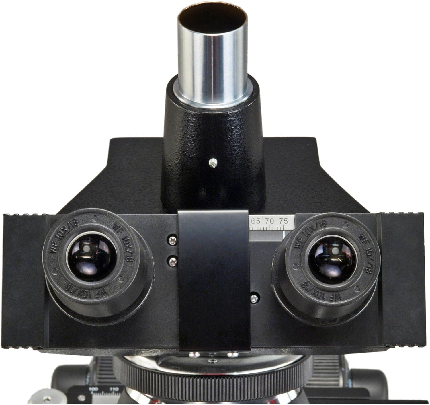 Interpupillary distance: sliding adjustable 2-3/16inch ~ 2-15/16inch (55mm ~ 75mm); Diopter: adjustable on both eyepiece tubes; Nosepiece: revolving quadruple; Stage: mechanical stain-resistant double layer, size: 5-1/2inch x 5-1/2inch (140mm x 140mm), translation range: 3inch x 2inch (75mm x 50mm); Photo tube adjustment range: 5/8inch (15mm); Focus: coaxial coarse and fine focus knobs on both sides, rack and pinion adjustment, with tension control